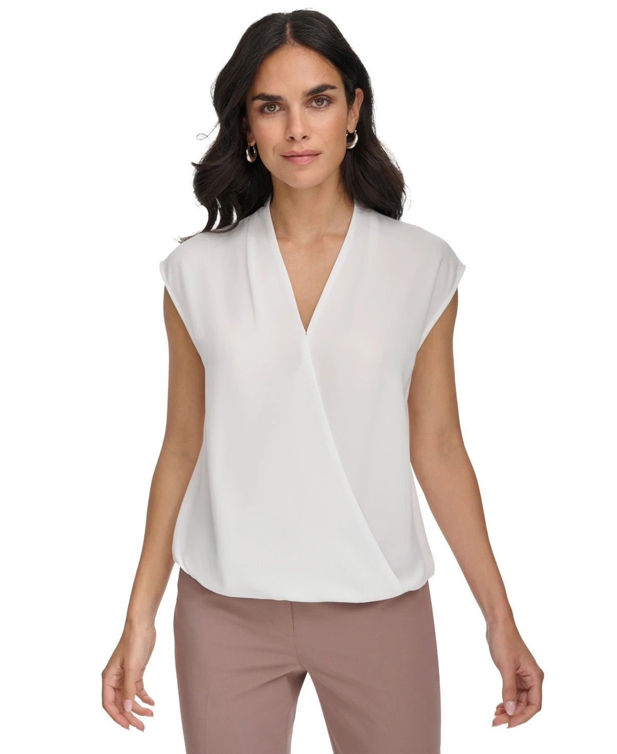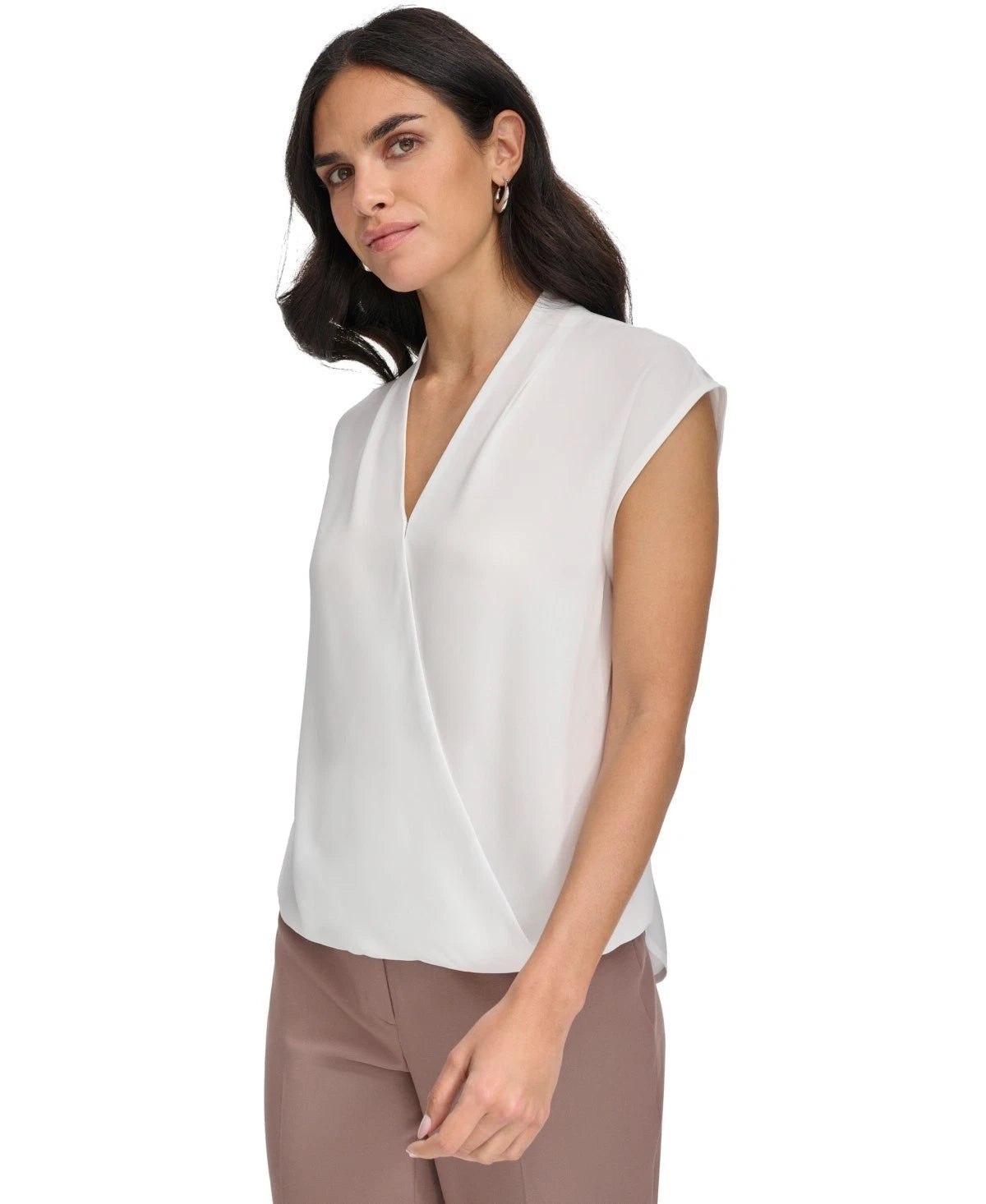 Elevate your wardrobe with this faux-wrap blouse from Calvin Klein, offering a sophisticated and chic look.