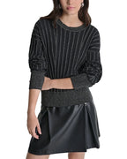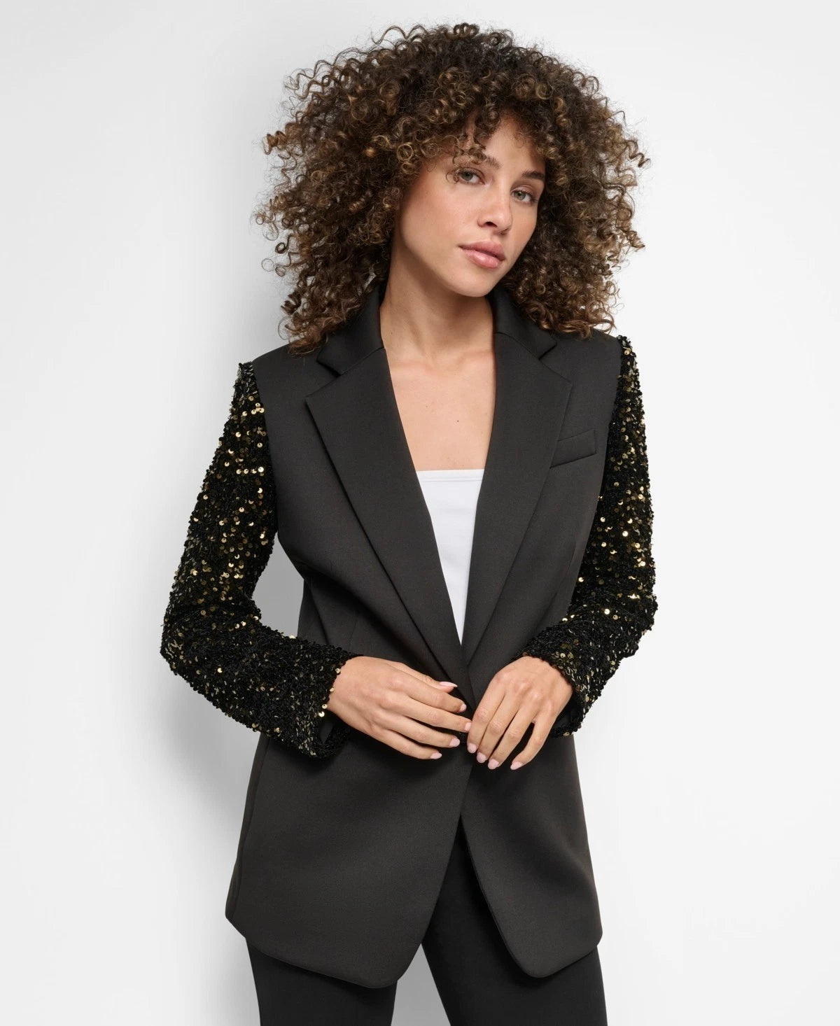 Professional tailoring gets a fun twist on this DKNY blazer, framed with sequinned sleeves that are ready to go from work to play.