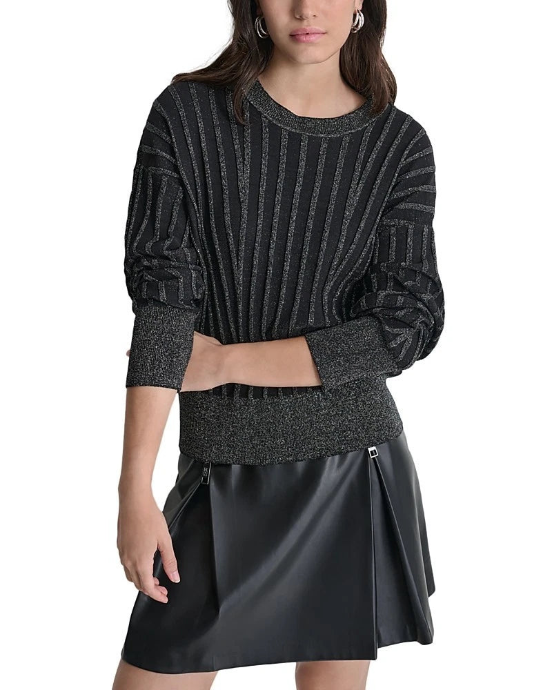 DKNY Women's Striped Dropped-Sleeve Crewneck Sweater Black Size L MSRP $99