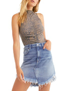 Free People Juniors' Bailey Denim Mini Skirt Blue Size 24 MSRP $68High wasted,washed denim mini skirt featuring a statement raw fringe hem and button closure/zip fly
