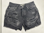 Details: High rise waist, zip fly with button closure, belt loops, classic five pocket styling, A-line mini silhouette, distressed shredding at front and back, raw frayed hem, rigid non-stretch denim designed for casual everyday wear