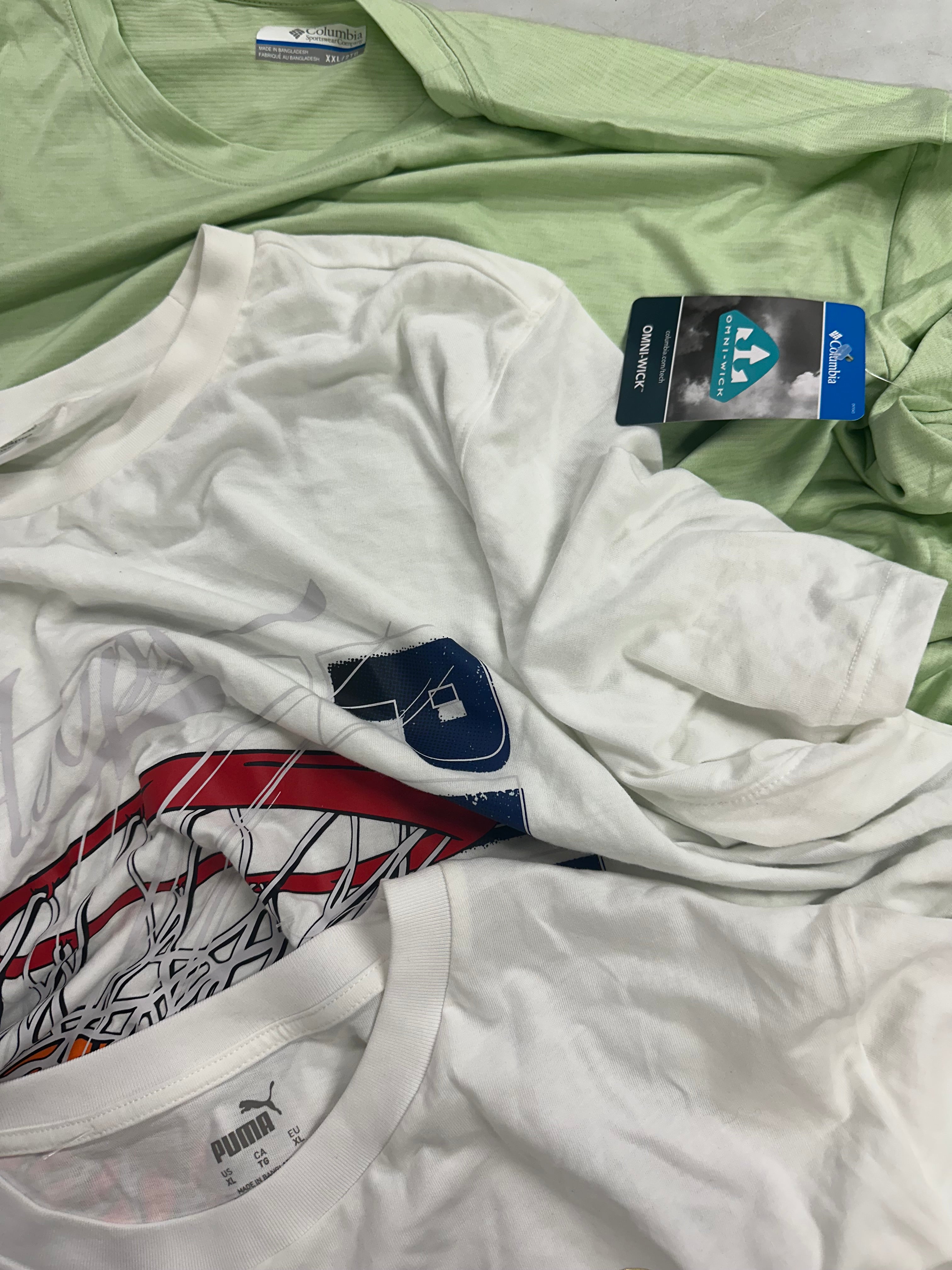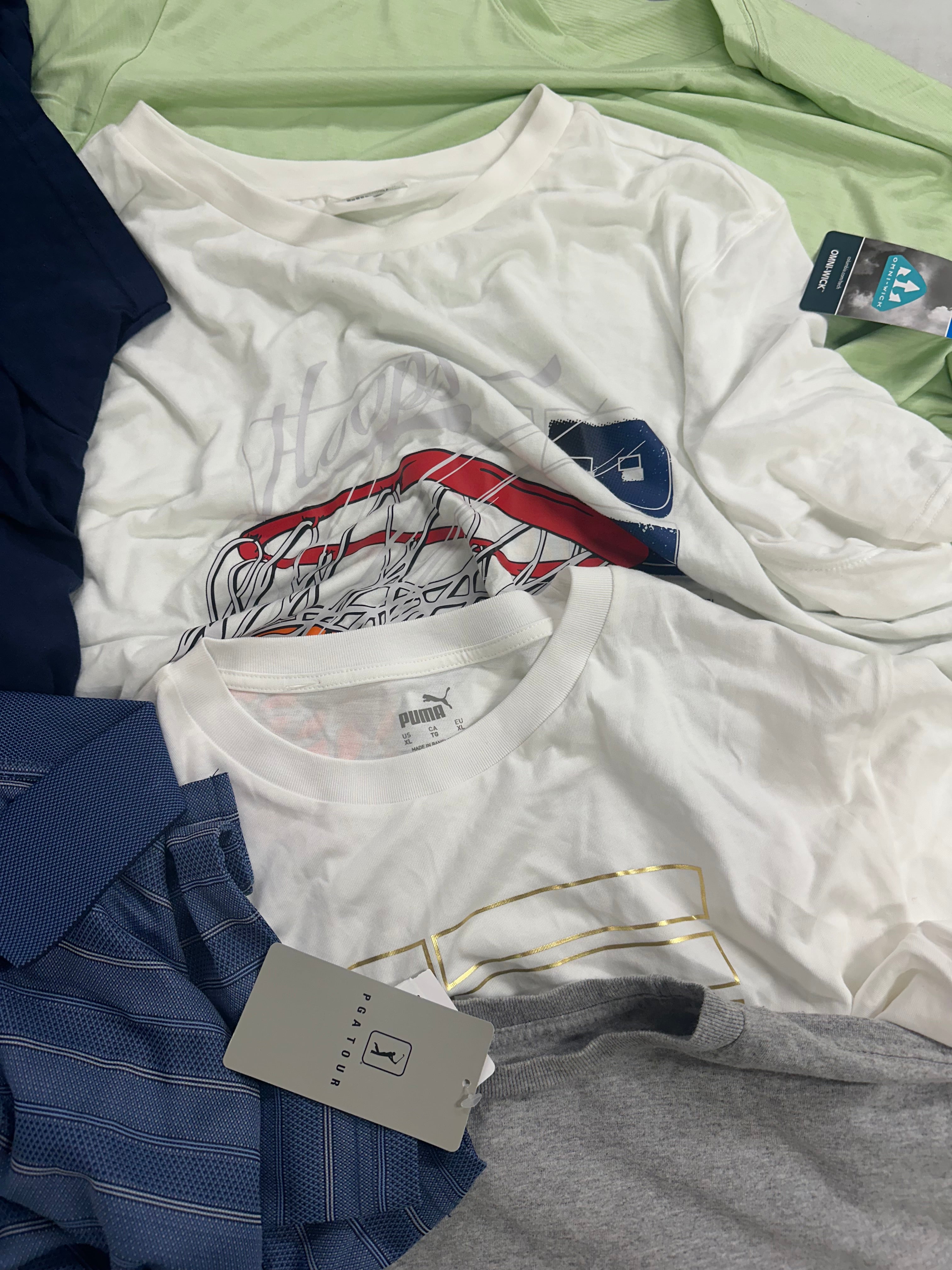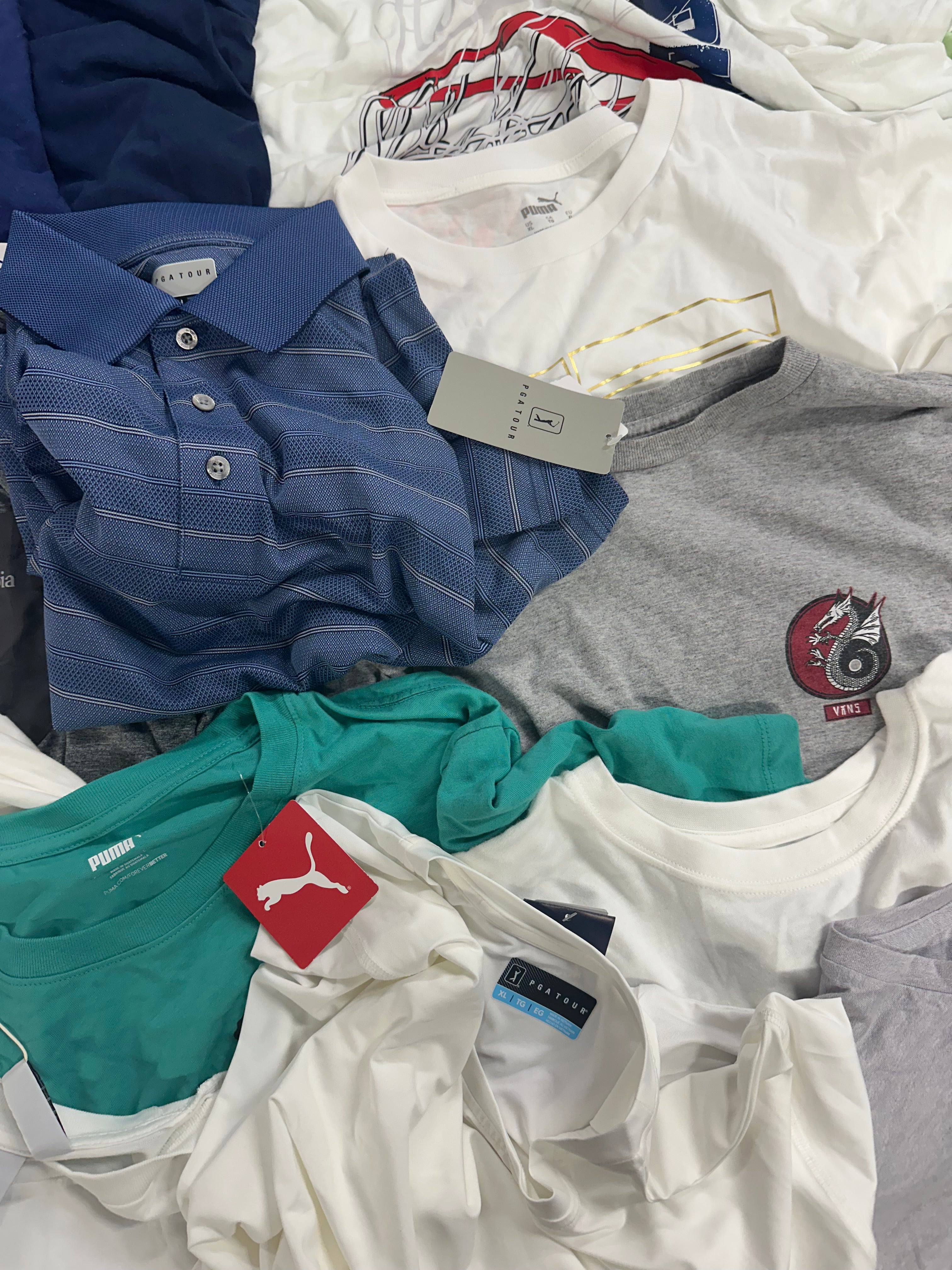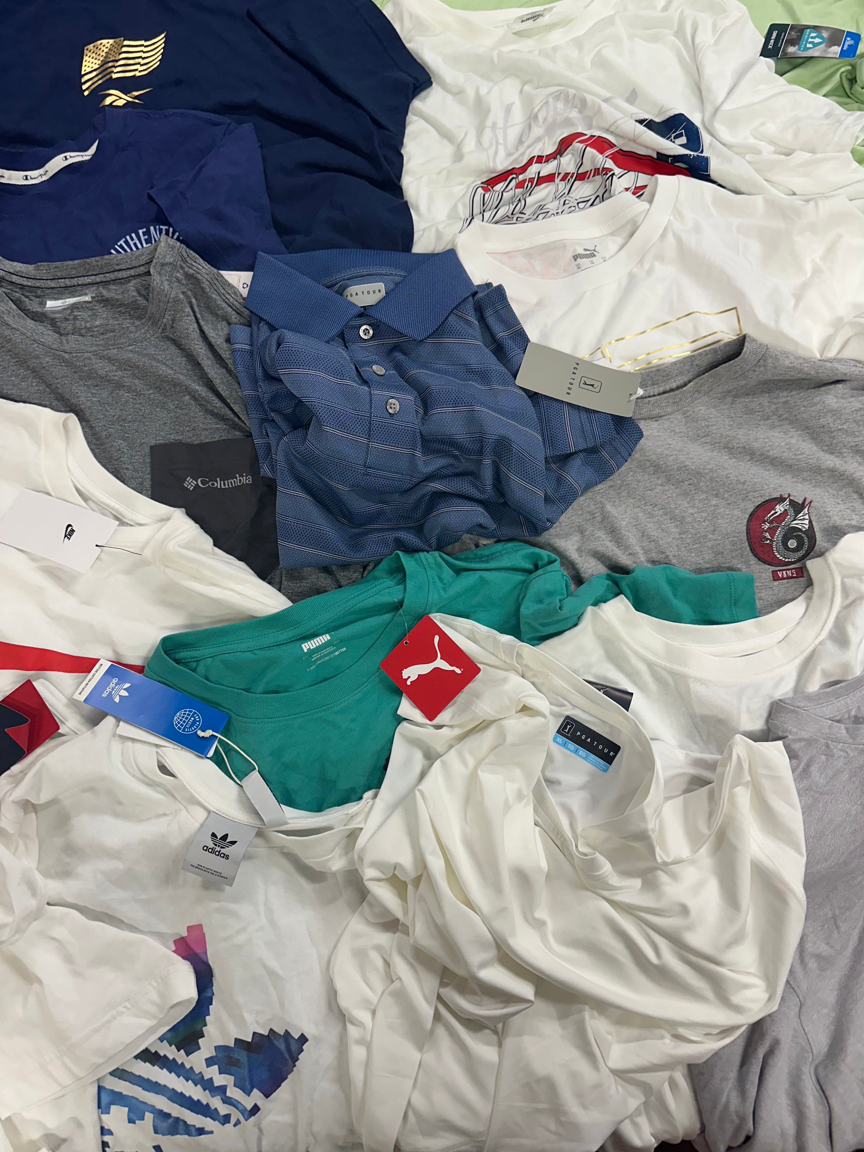 Men's Clothing T-Shirts Wholesale Lot, ADIDAS, NIKE, COLUMBIA, PUMA, QUIKSILVER, REEBOK and more, 17 items, Shelf Pulls, MSRP $555