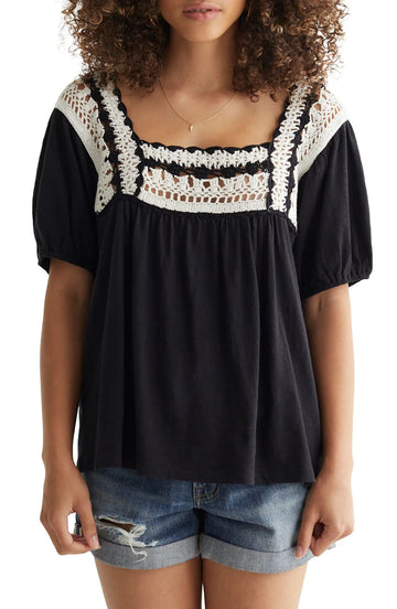 Lucky Brand Crochet Square Neck Cotton Knit Top Black Size XS MSRP $70