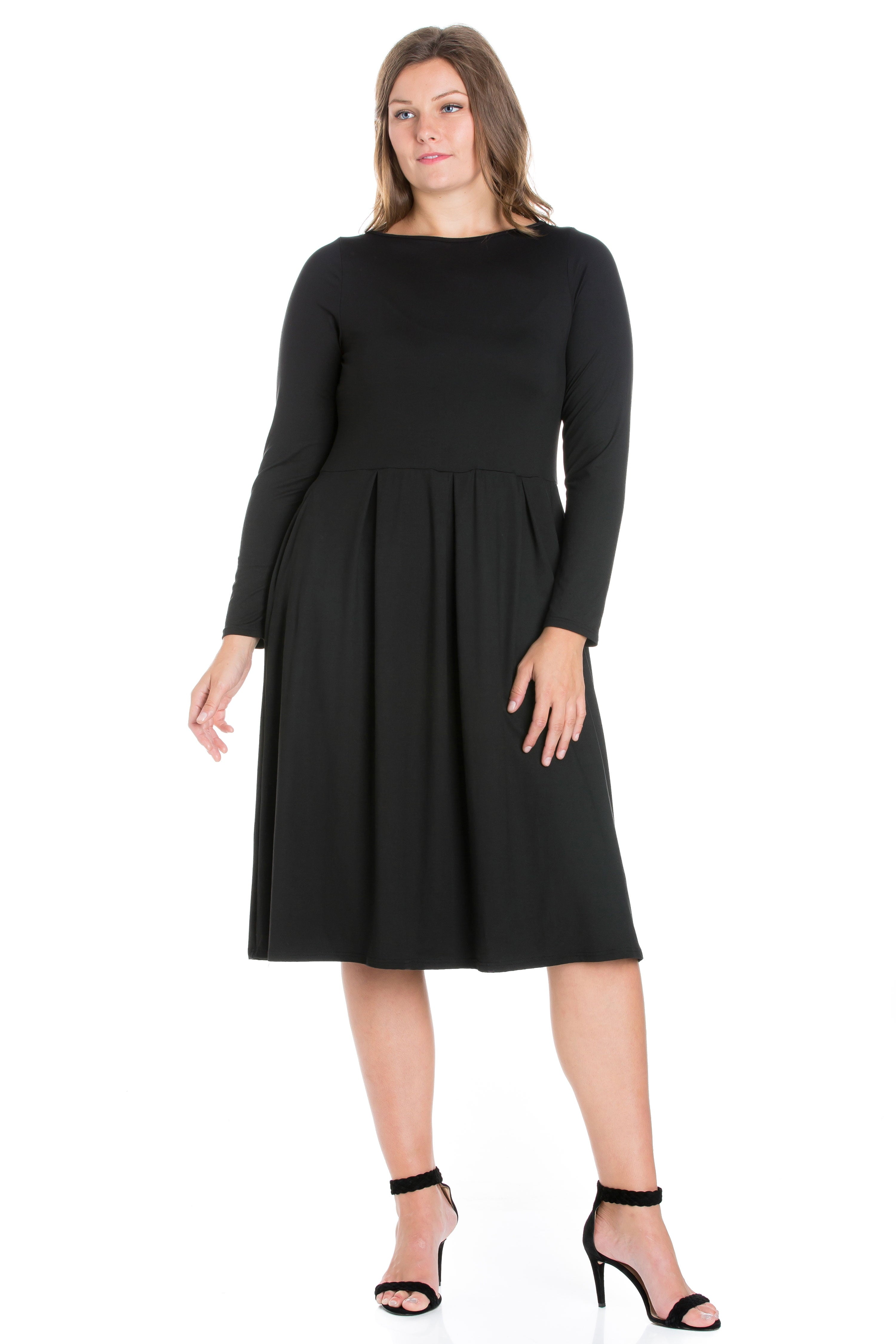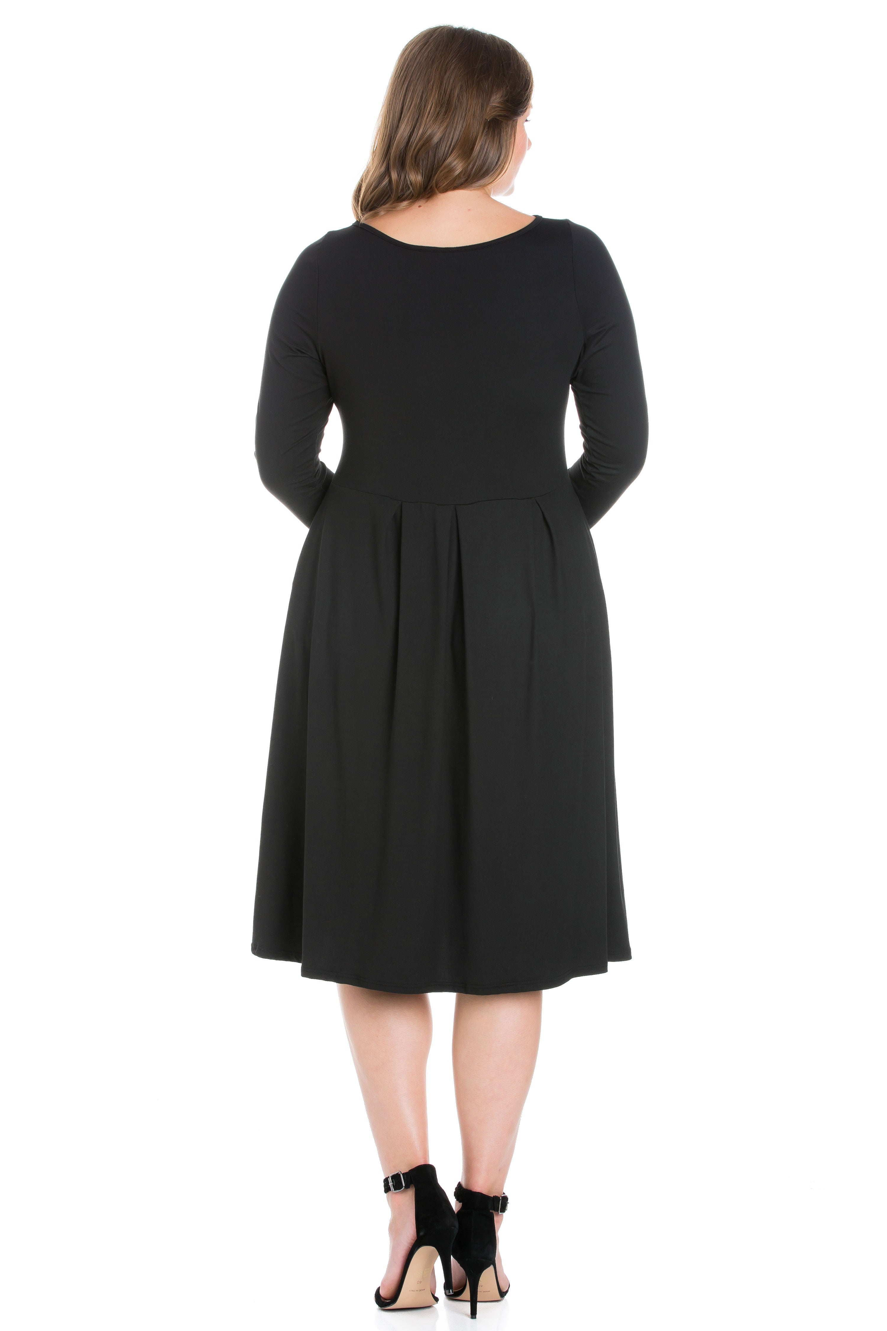 This classic, timeless style features an A-line skirt with large pleats, a round neckline, long sleeves, and midi length. The fit and flare plus size dress can be accessorized to match any personality or worn alone in its simplicity. The beautiful color options and fit make for a timeless look.