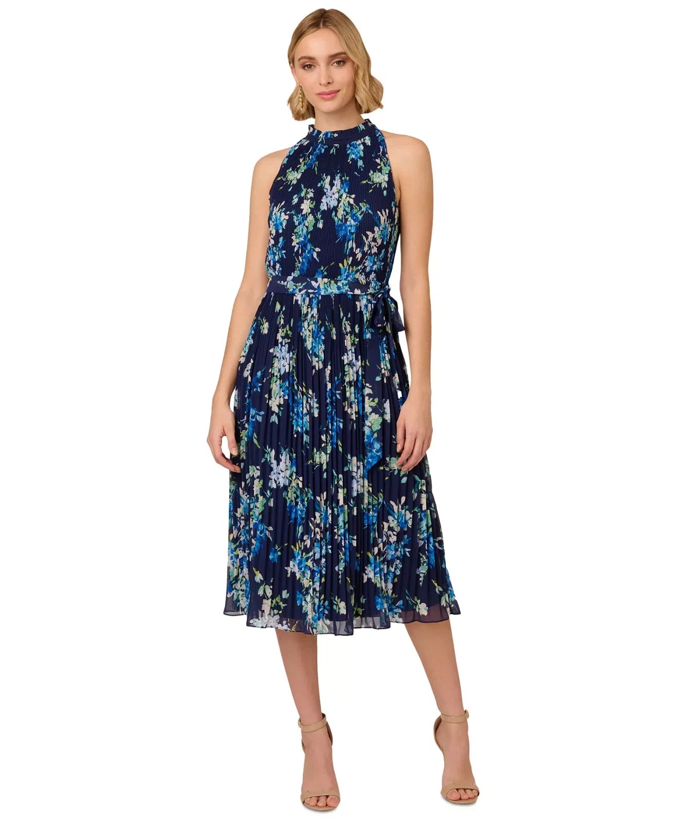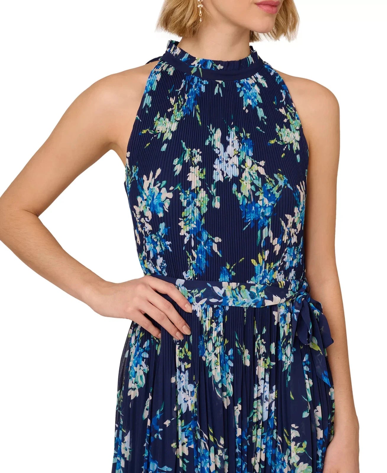 Adrianna Papell Women's Floral Pleated Chiffon Dress Blue Size 10 MSRP $189