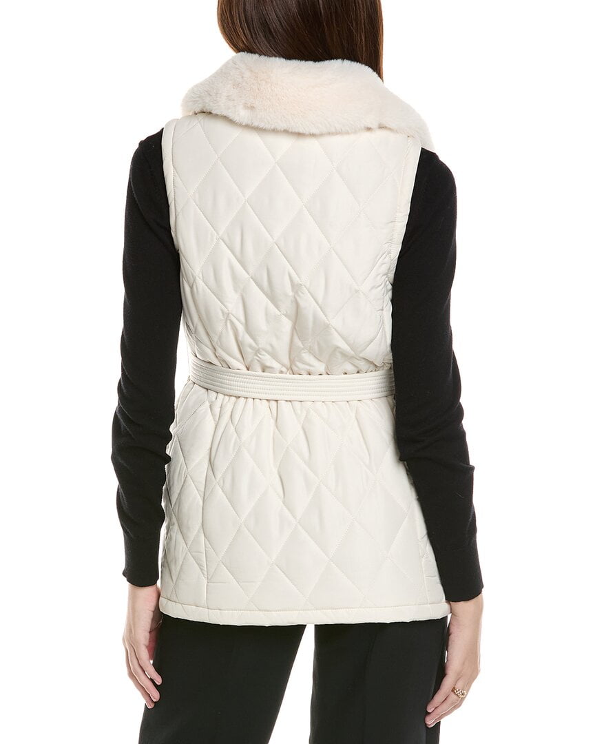 About the brand: Feminine designs for the global woman. Quilted Vest in white with faux fur collar lining, front slip pockets, belted waist Approximately 28.5in from shoulder to hem Zipper closure Lightweight 100% polyester Dry clean only Imported