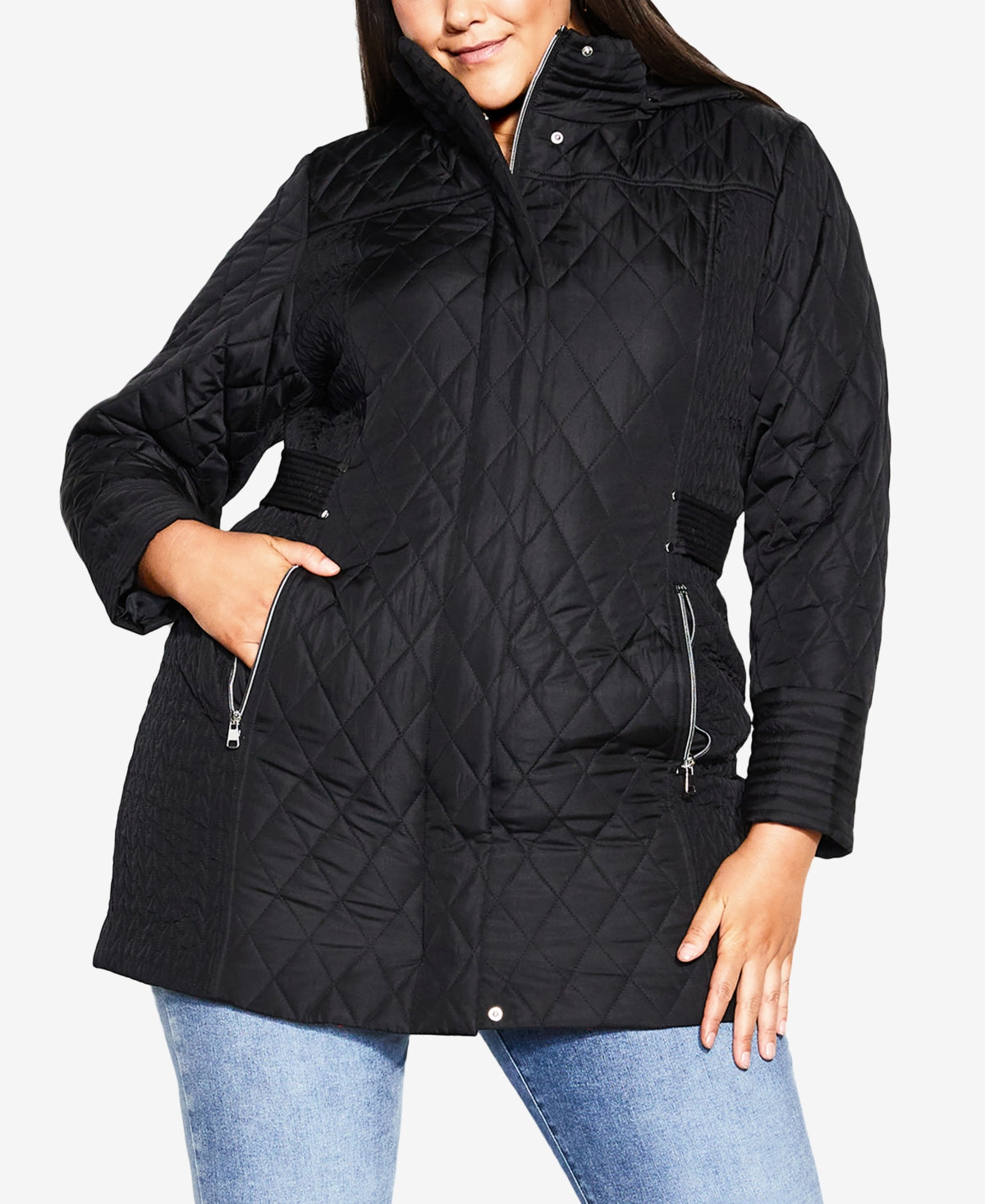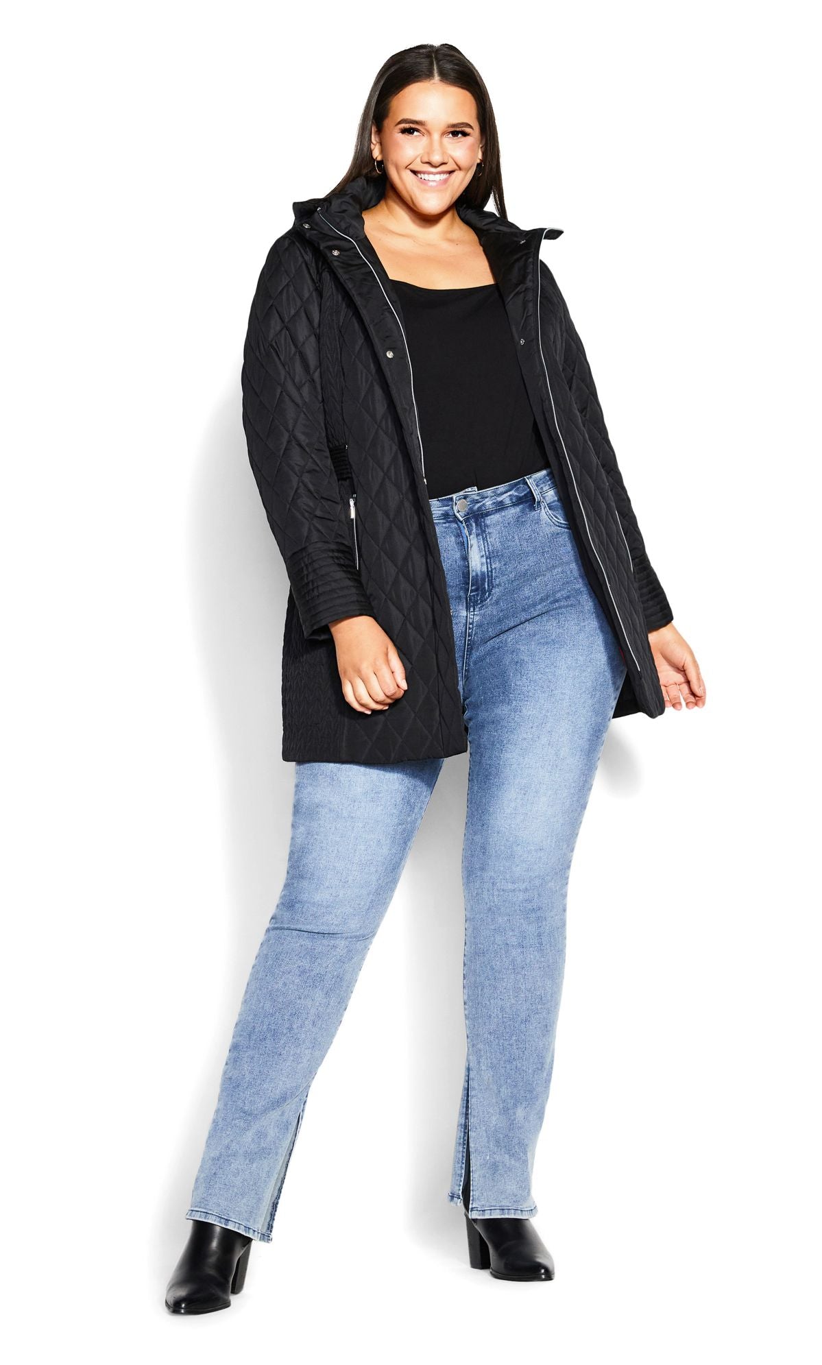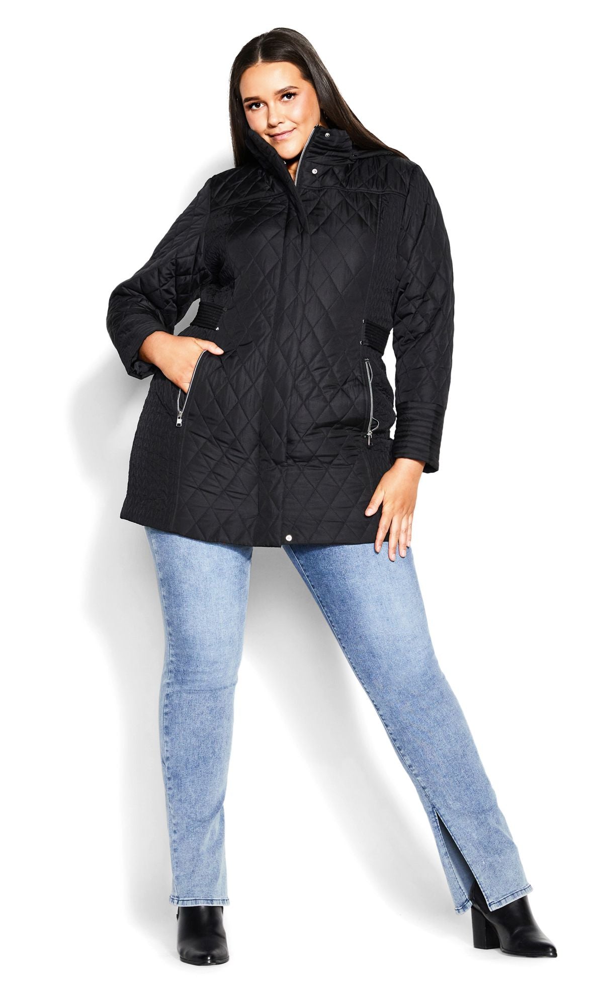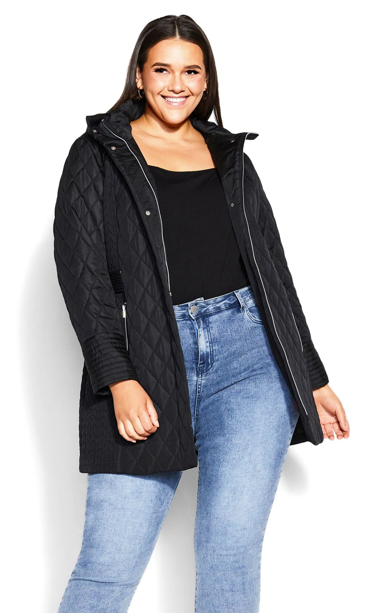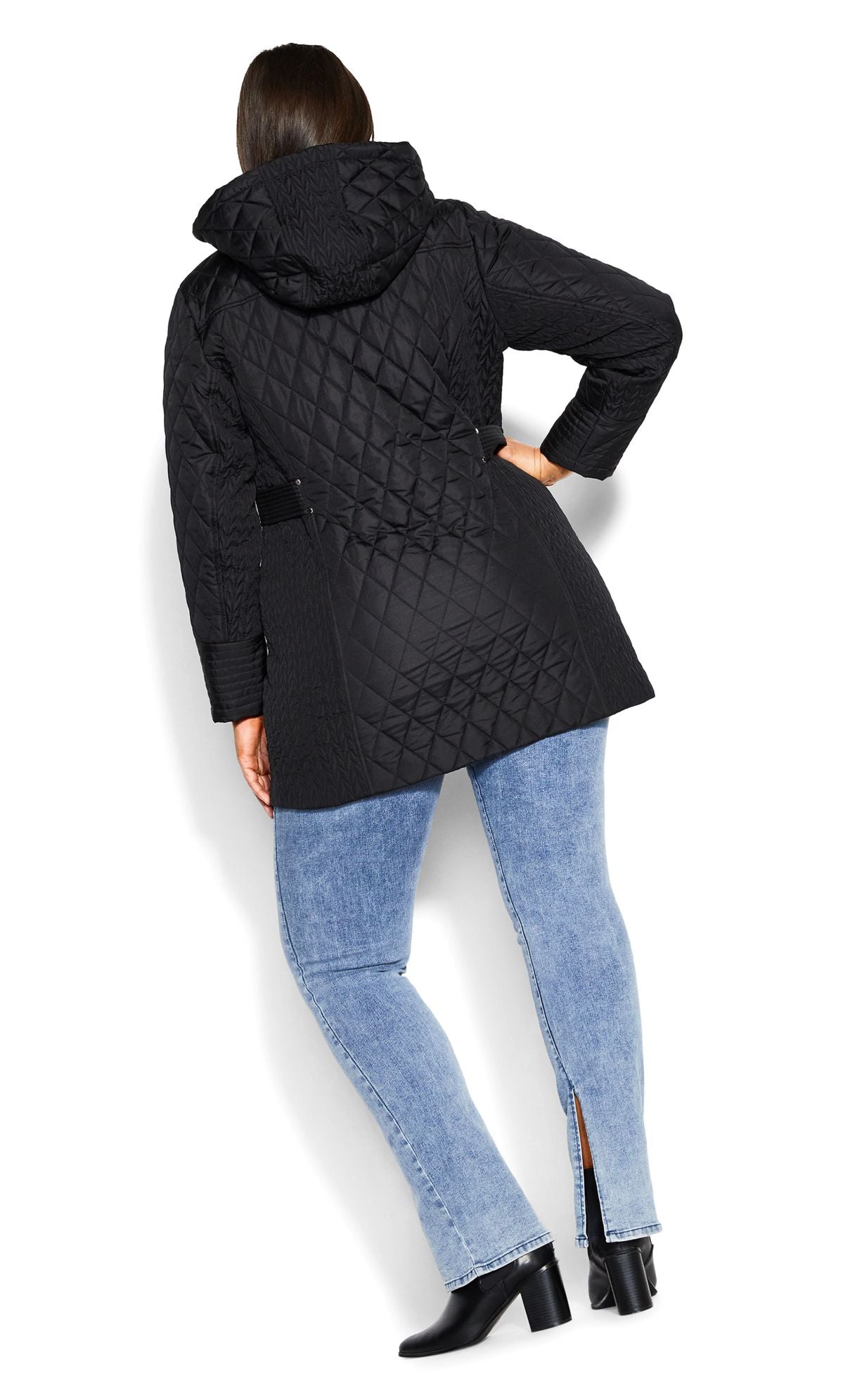 Description: Bring light layers to your outerwear collection with our Quilted Multi Panel Coat in a classic black hue. The quilted design bring a touch of luxury to this coat, while the padded fabrication keeps you warm all day long. Key Features Include: - Quilted detail - Padded fabrication - Full-length sleeves - Functional hip pockets with zips - Detachable hood - Zip up front with poppers Layer over a colorful, knit dress to bring a pop of color to your look.