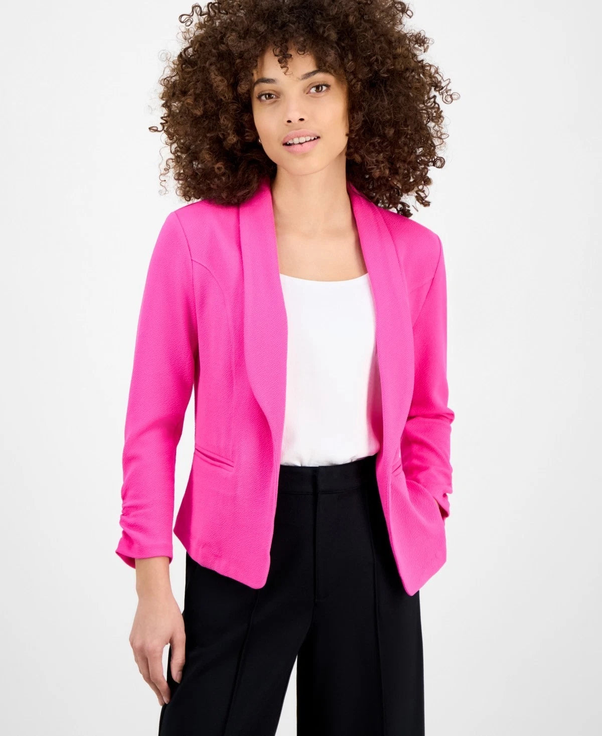 Bar III adds a sophisticated touch to your look with a ruched-sleeve petite blazer. Shawl lapels make the perfect finishing touch.
