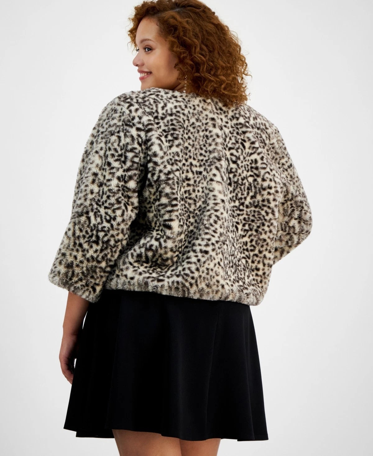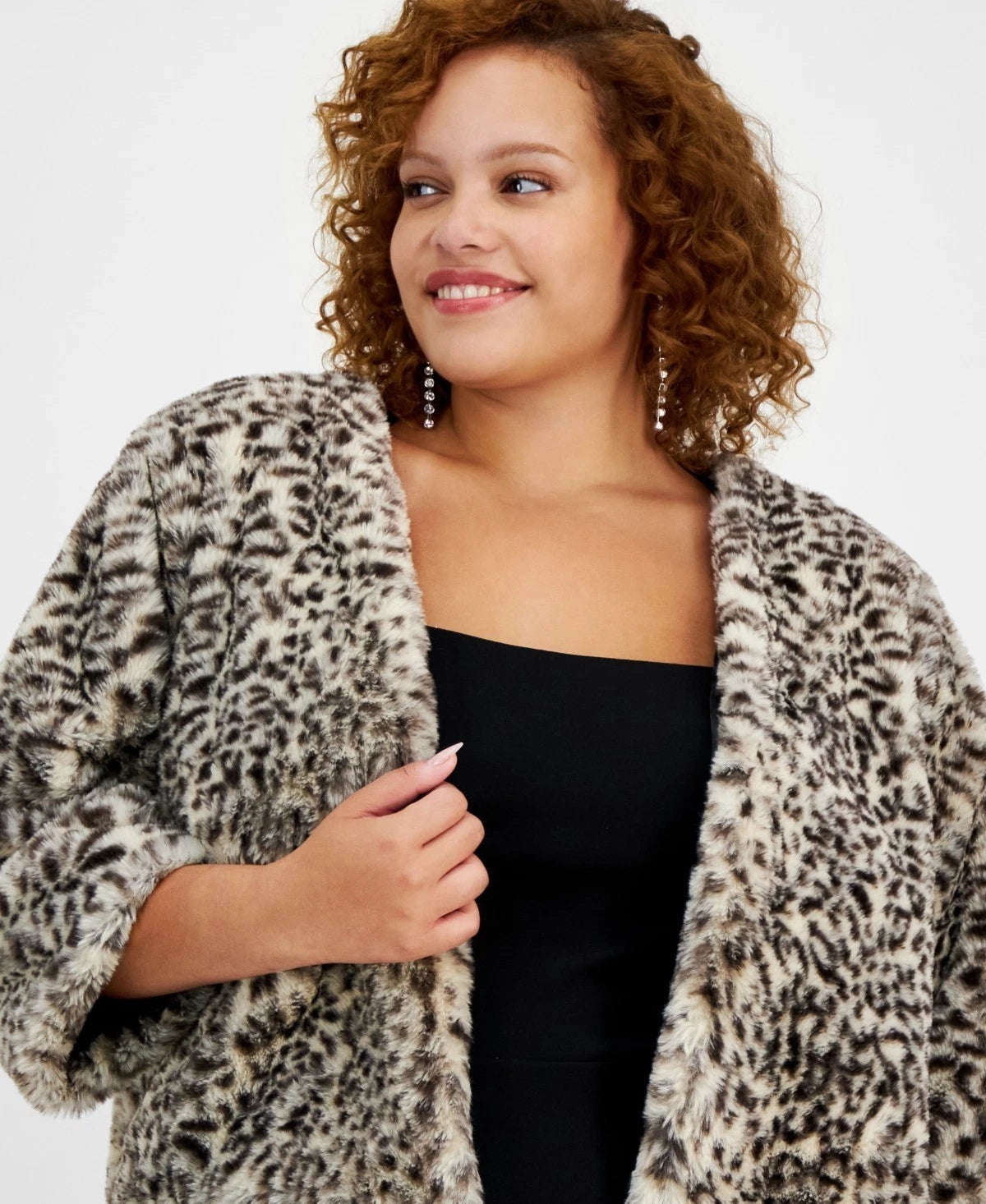 Soft and plush animal print faux fur gives a luxurious touch to this plus size open-front shrug from BCX, making it the perfect finishing touch for your event outfit.