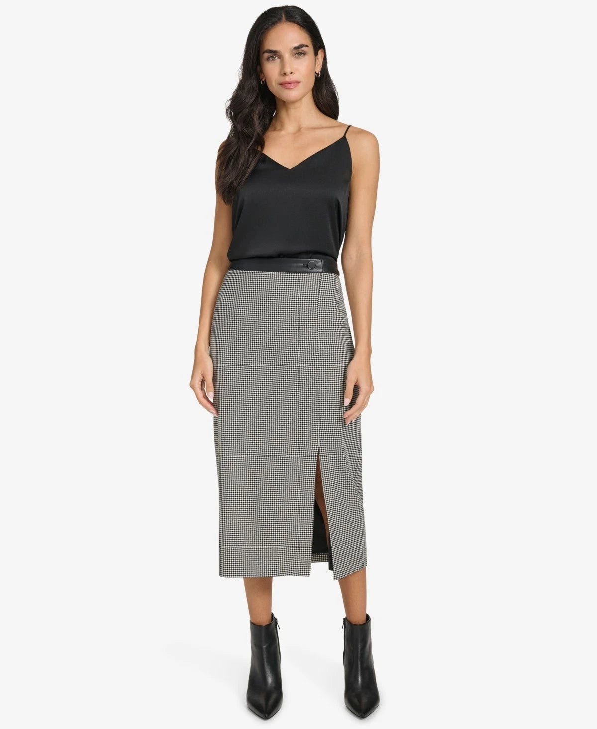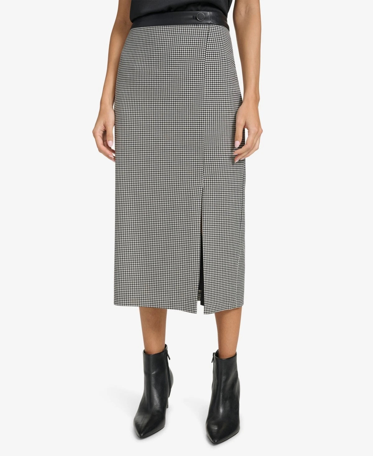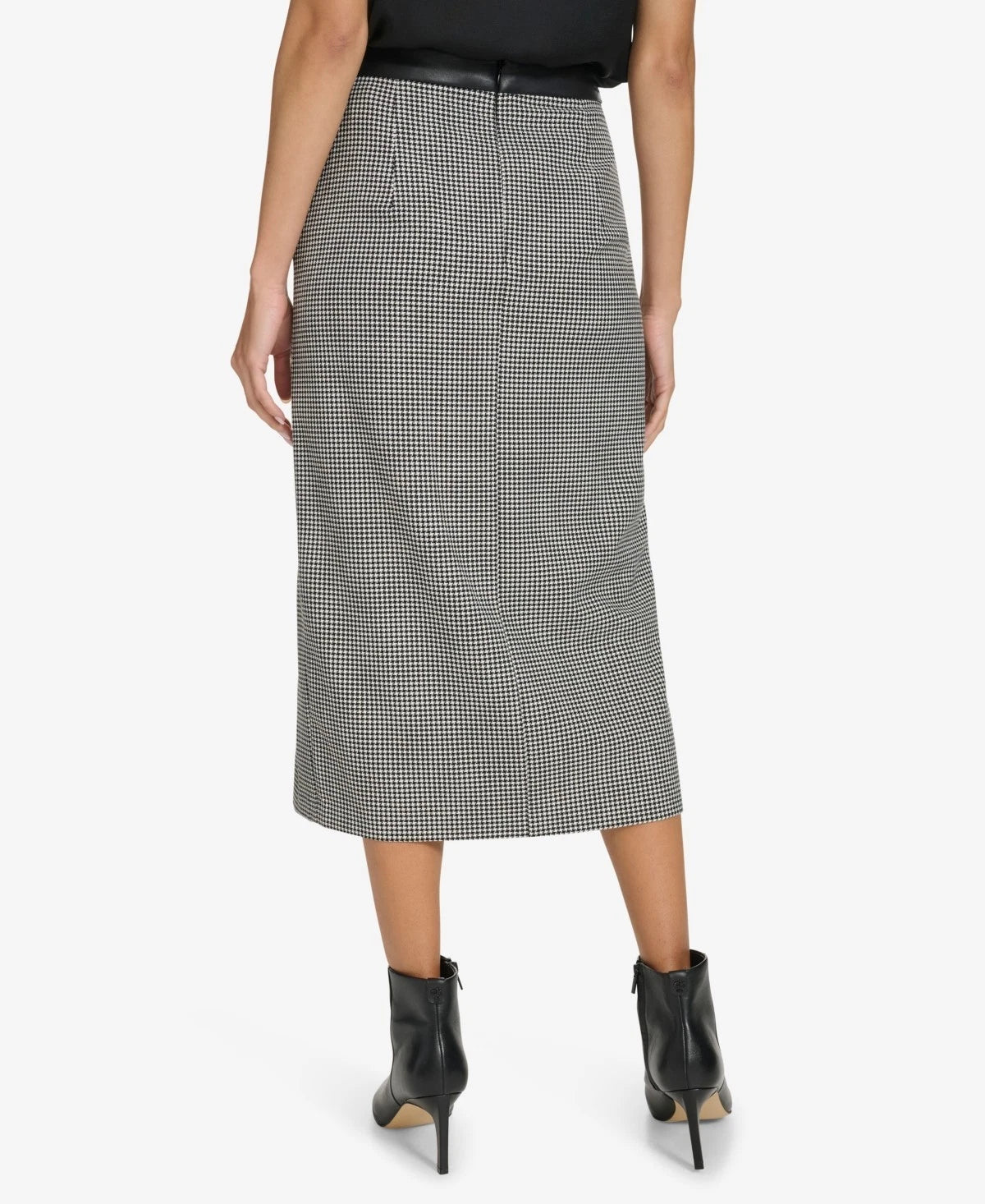 Calvin Klein adds subtle faux-leather trims to this classic pencil skirt, adding an extra touch of upscale polish, designed for a petite frame.
