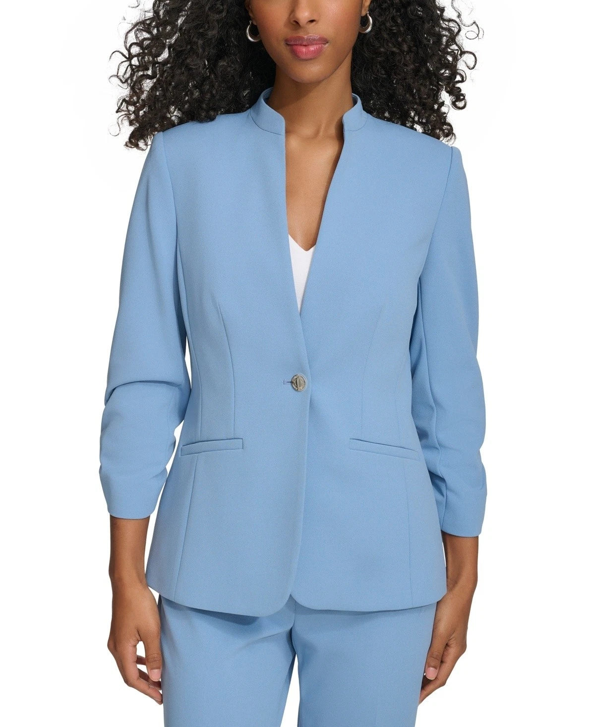 Designed with buttoned ruched sleeves and a stand collar, Calvin Klein's single-button jacket adds sophisticated style to your wardrobe.