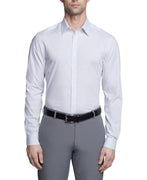 The Calvin Klein Steel+ dress shirt is engineered for performance. High-tech wrinkle-free stretch fabric requires less ironing, while wicking properties pull away moisture for cool, dry comfort. A slim fit delivers a tailored look that defines refinement.