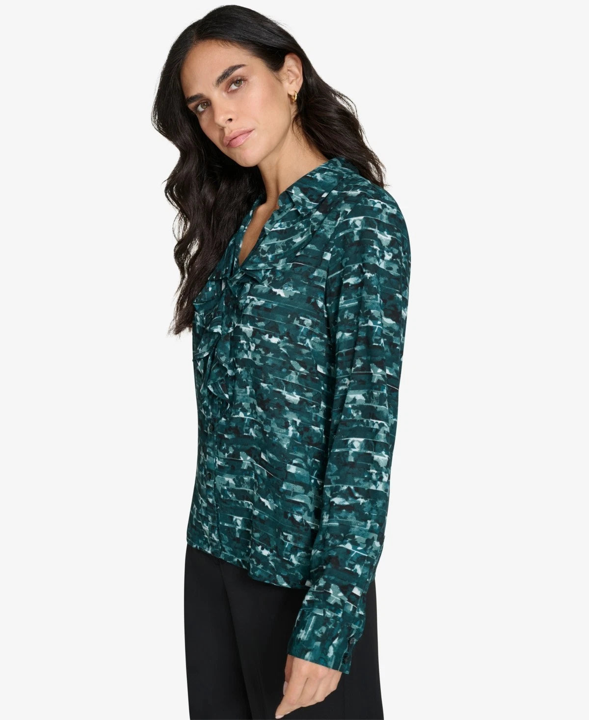 Calvin Klein Womens Printed Ruffle-Trim Button-Front Shirt Green Size M MSRP $79