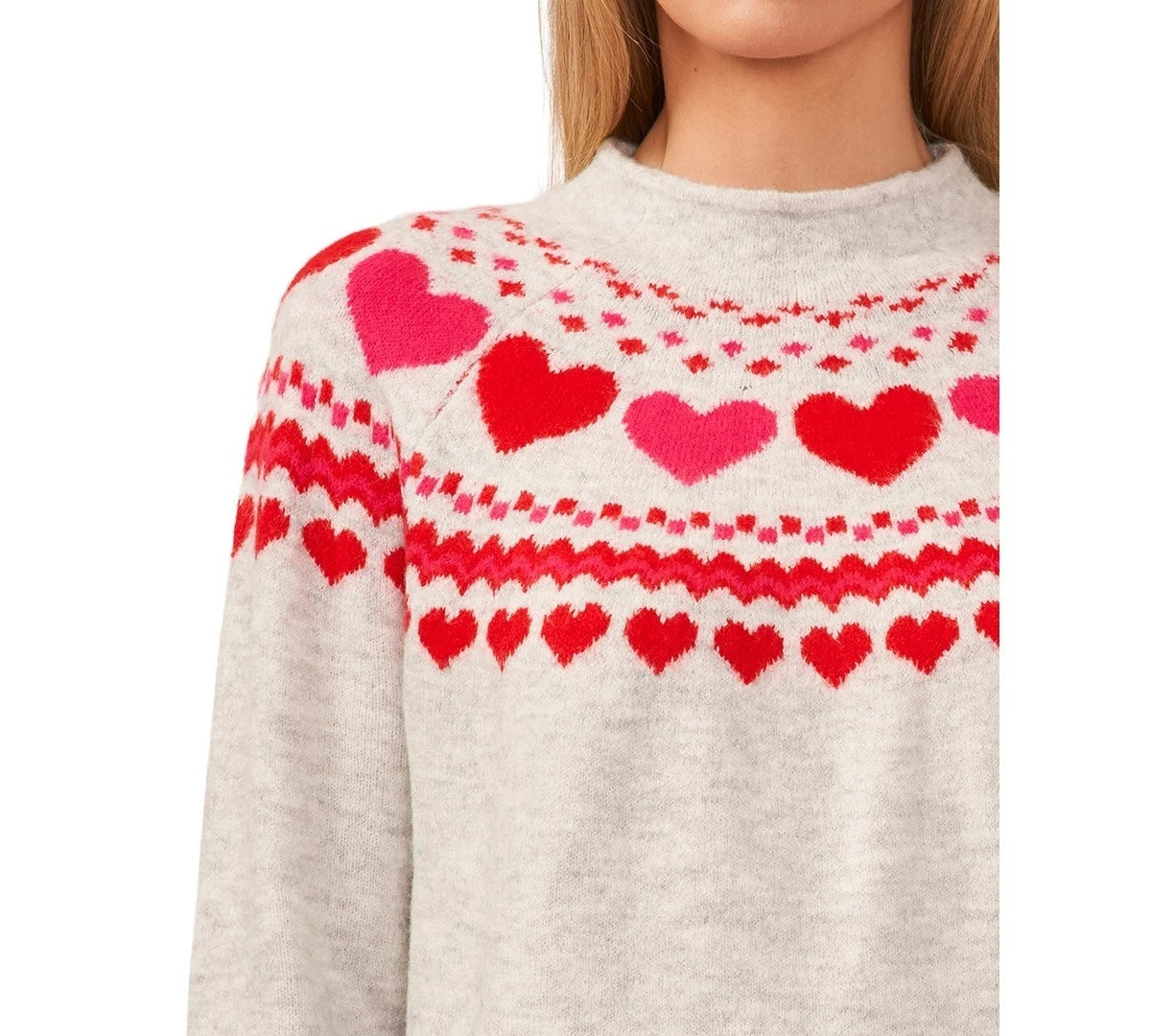 CeCe Women's Heart Fair Isle Mock Neck Long-Sleeve Sweater Gray Size L
