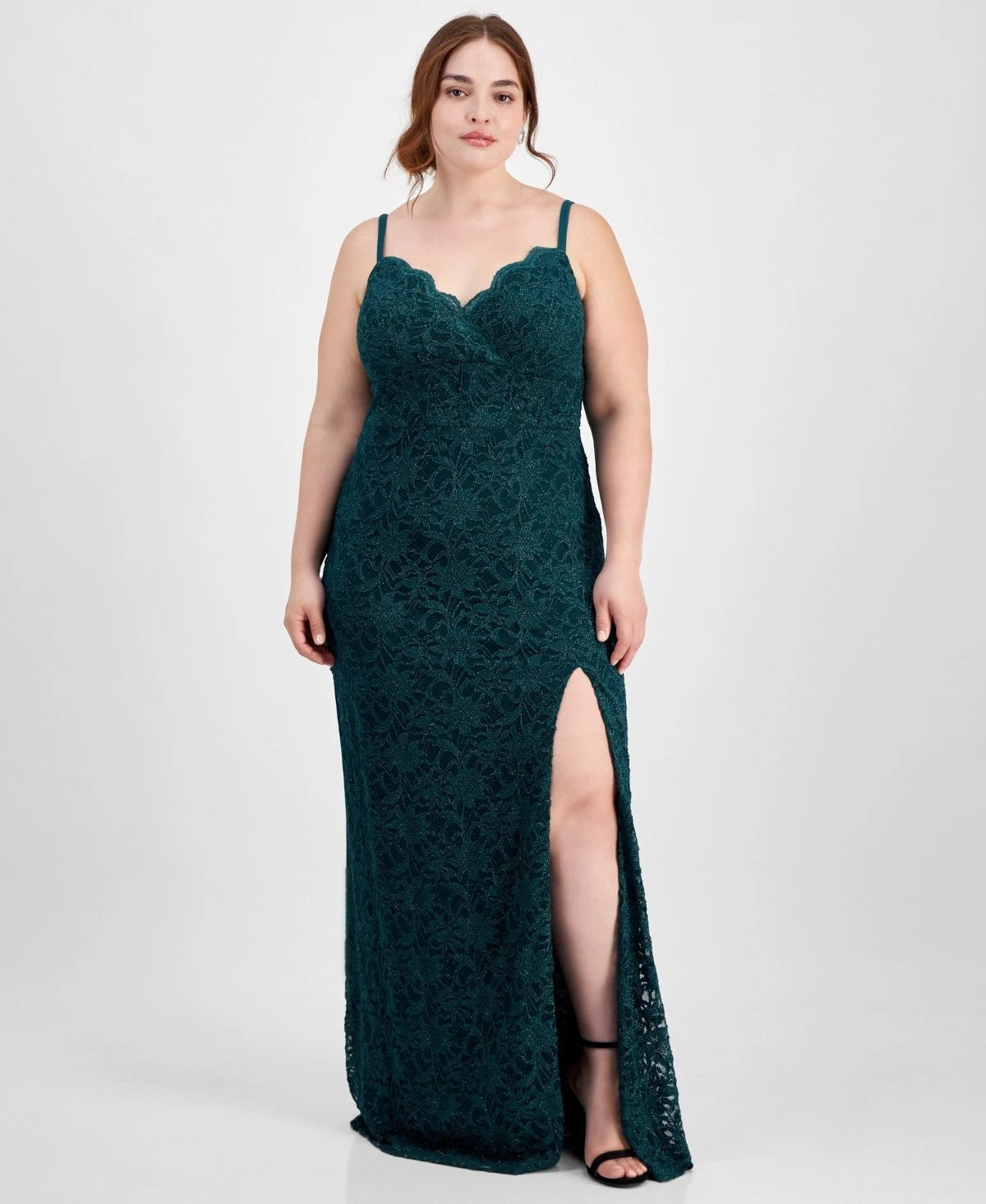 It's your night to shine in a stunning plus size gown from City Studios. This floor-sweeping style features glitter-enhanced lace and a sizzling thigh-high slit.