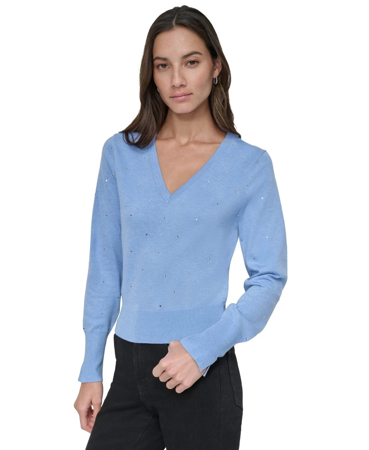 Shine on in a V-neck sweater from DKNY Jeans, upgraded with square rhinestone studs and split cuffs.