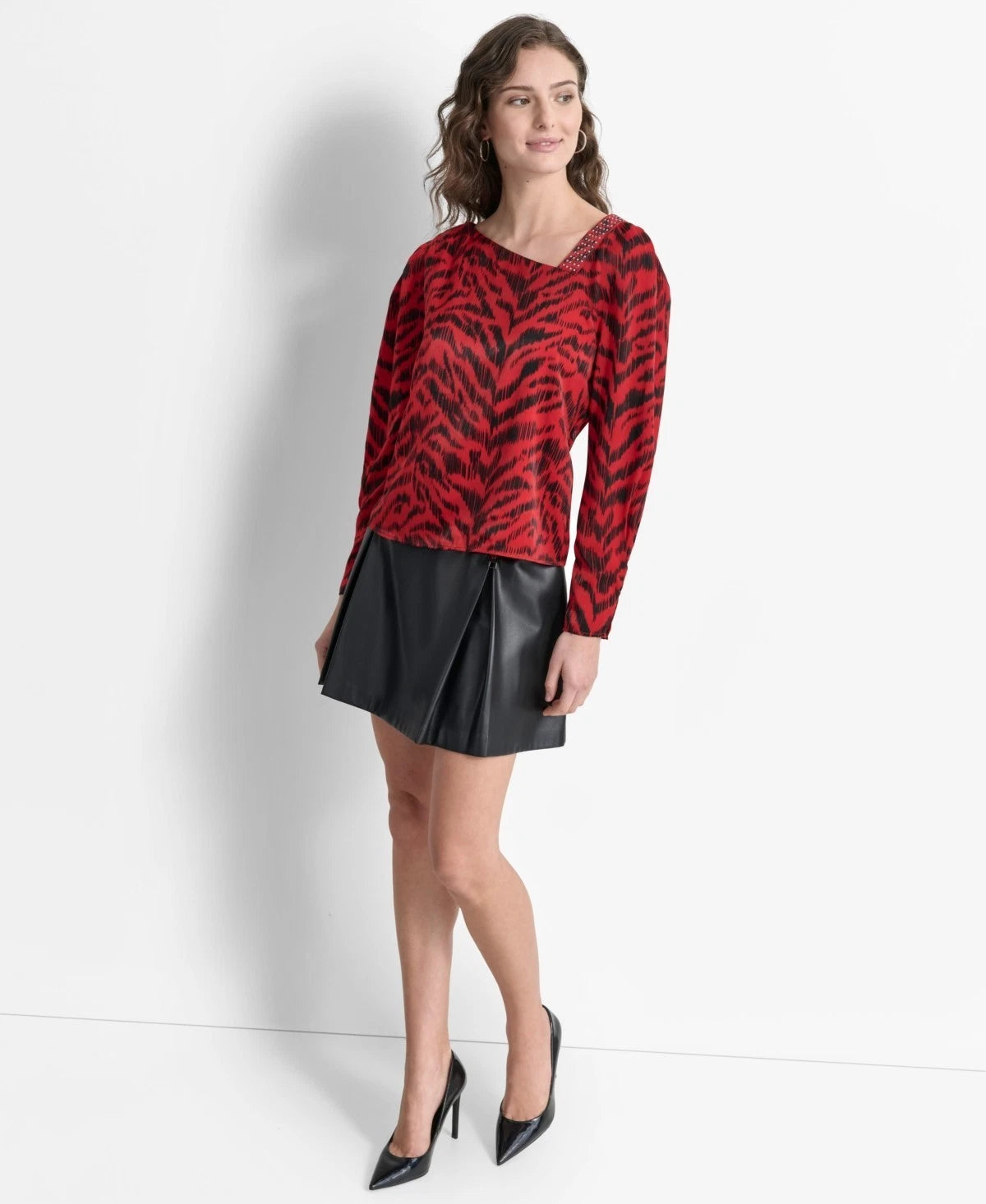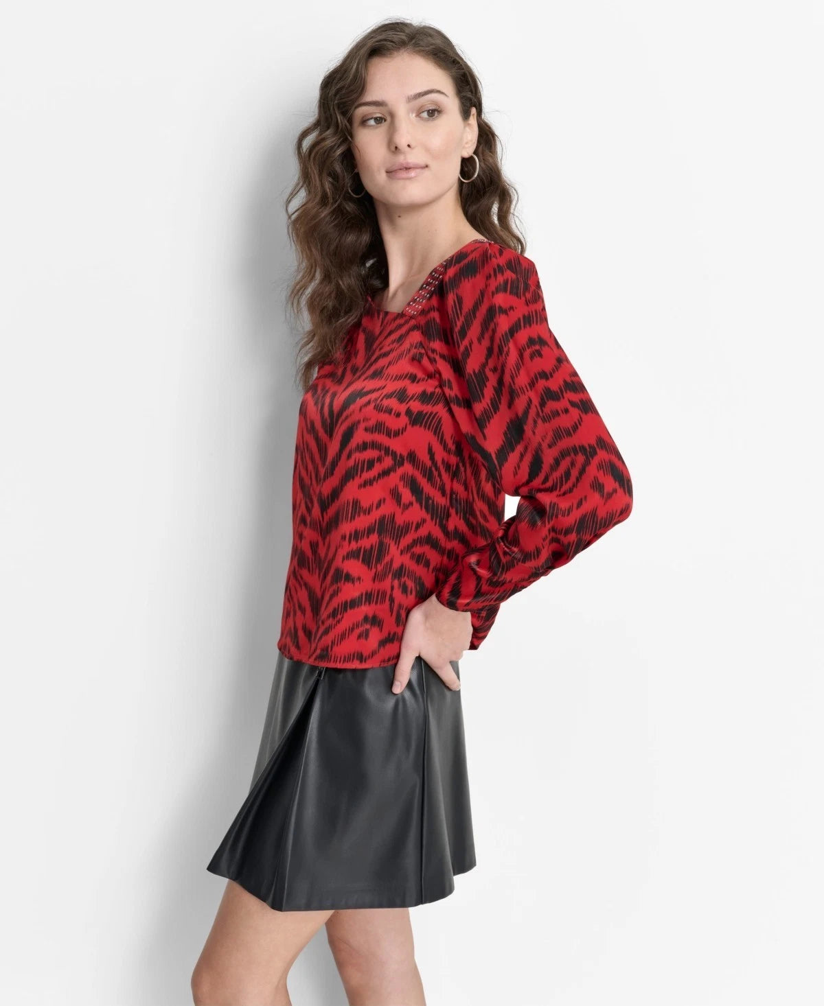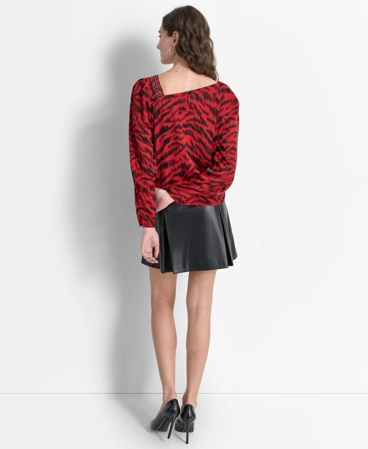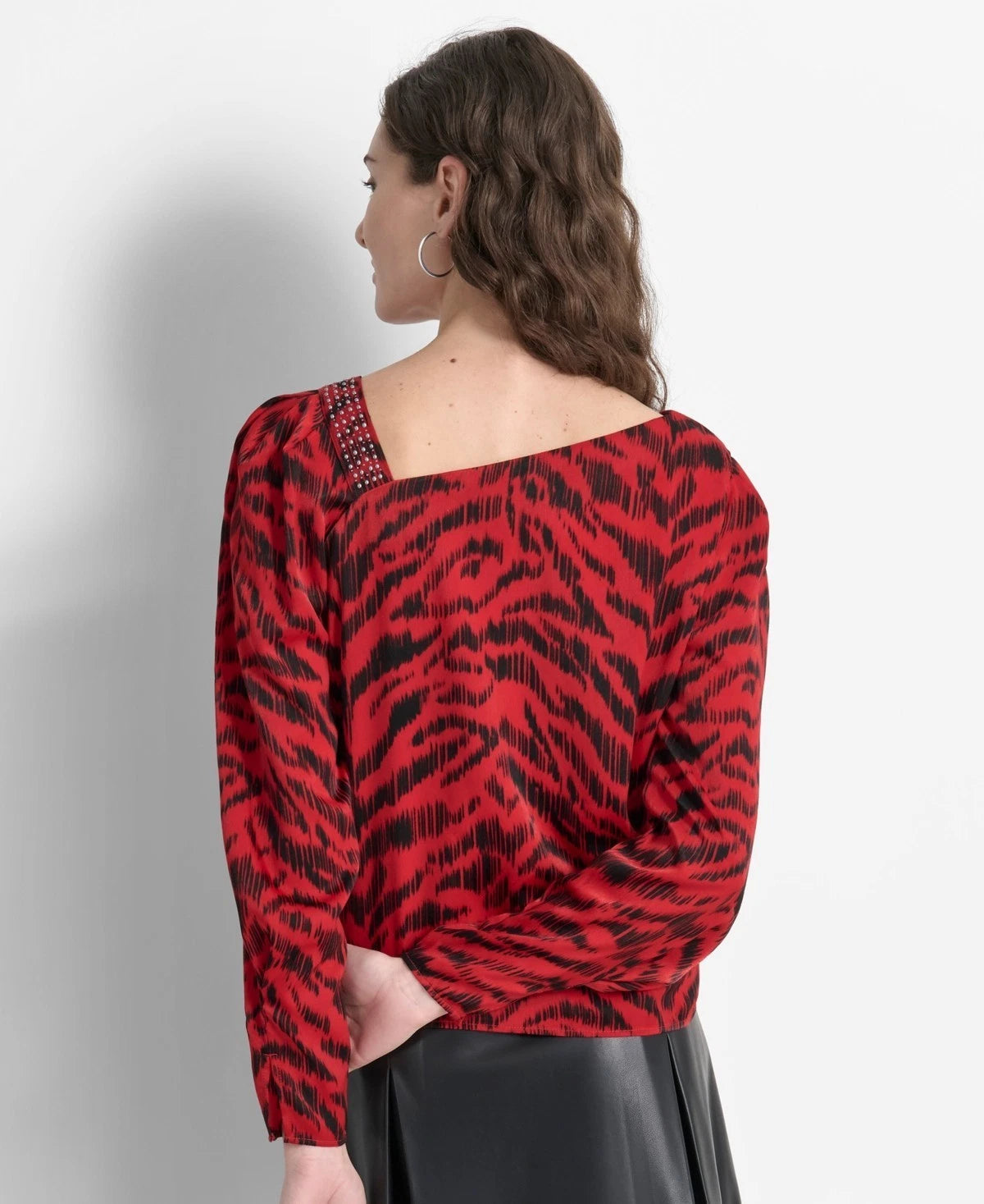 DKNY Women's Printed Asymmetric-Neck Long-Sleeve Blouse Red Size S MSRP $89
