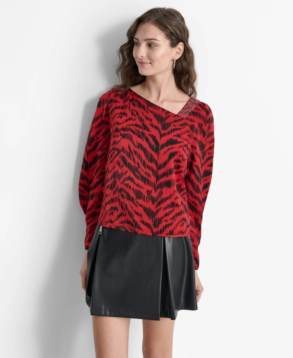 Elevate your office style with this DKNY women's asymmetric neck printed long sleeve blouse, blending modern design and sophistication for a bold look.