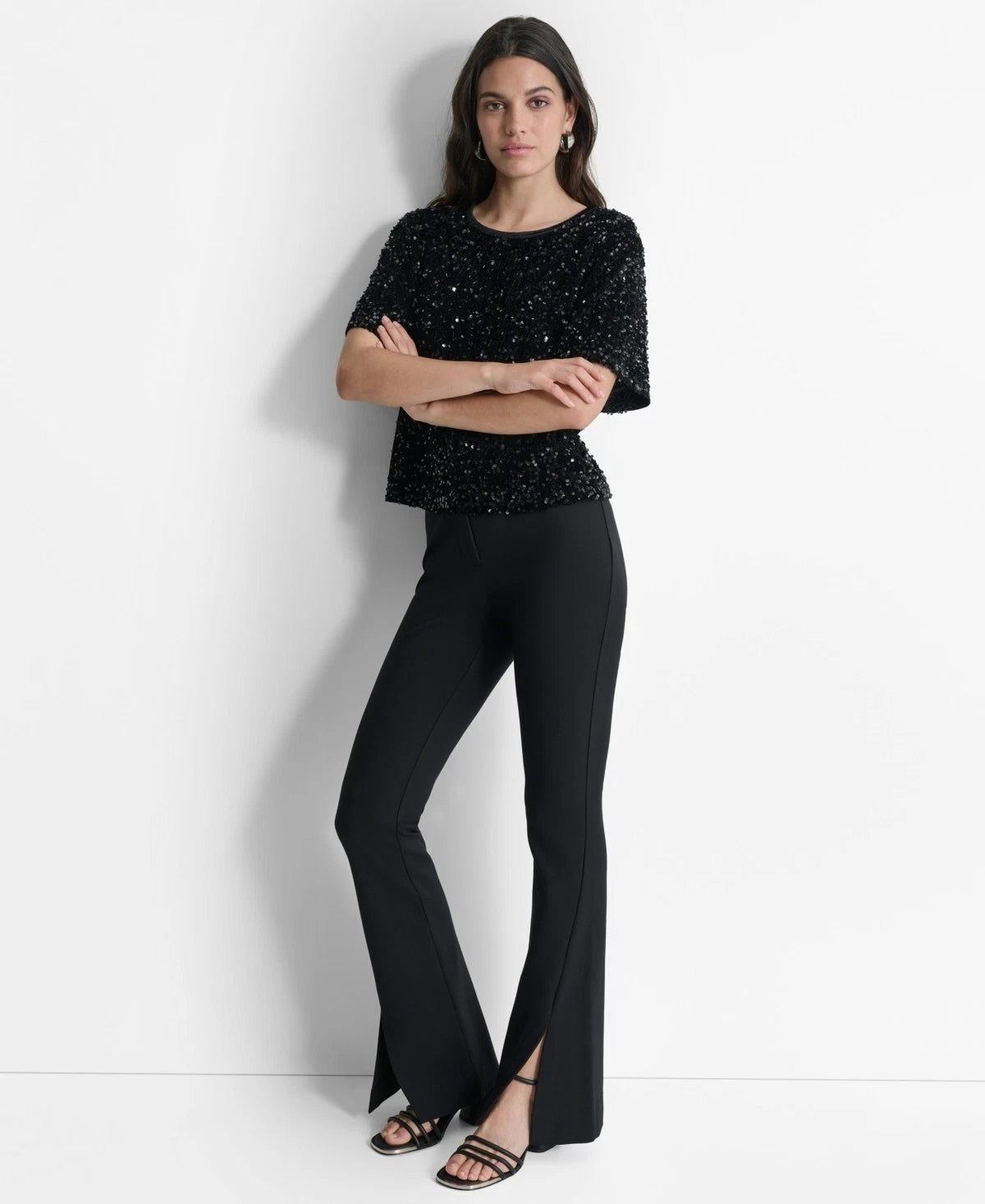 Shine with effortless elegance in this women's DKNY stretch velvet sequin top, combining luxurious velvet with dazzling sequins for a chic and glamorous look that's perfect for any special occasion.