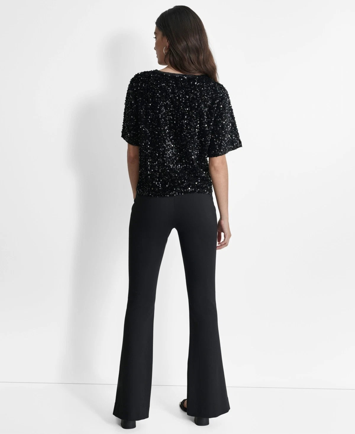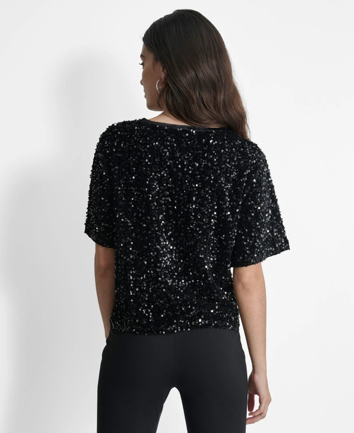 DKNY Women's Round-Neck Stretch Velvet Short-Sleeve Sequin Top Black Size M $89