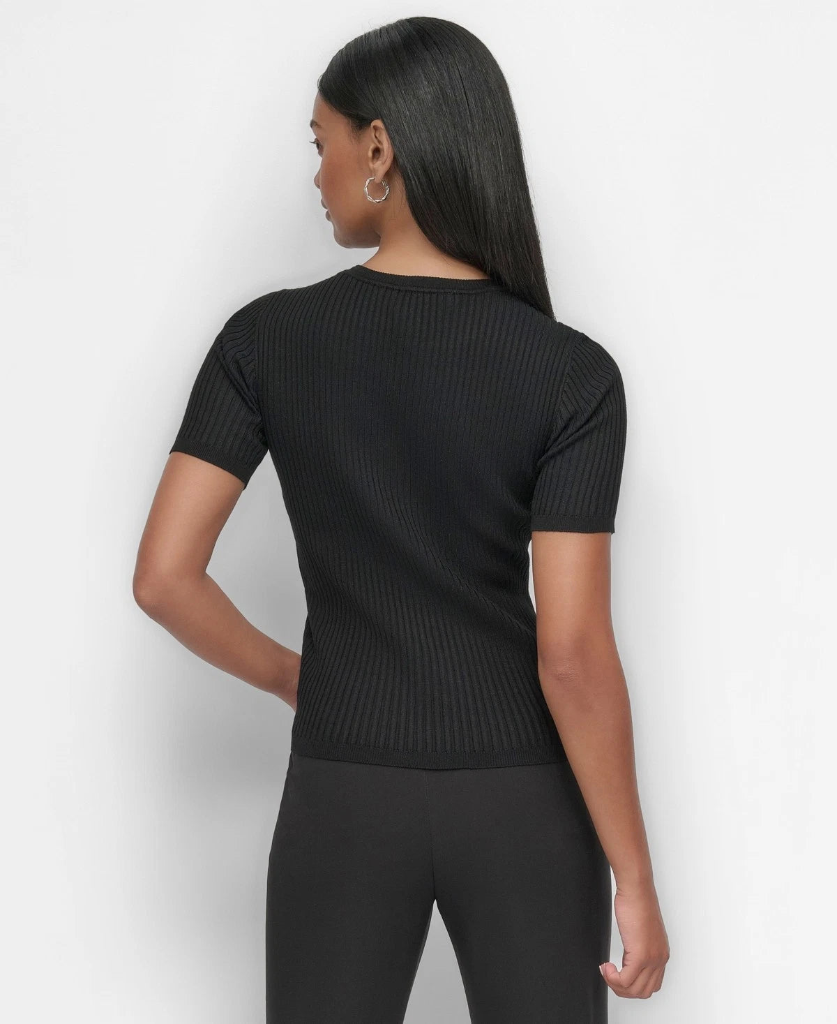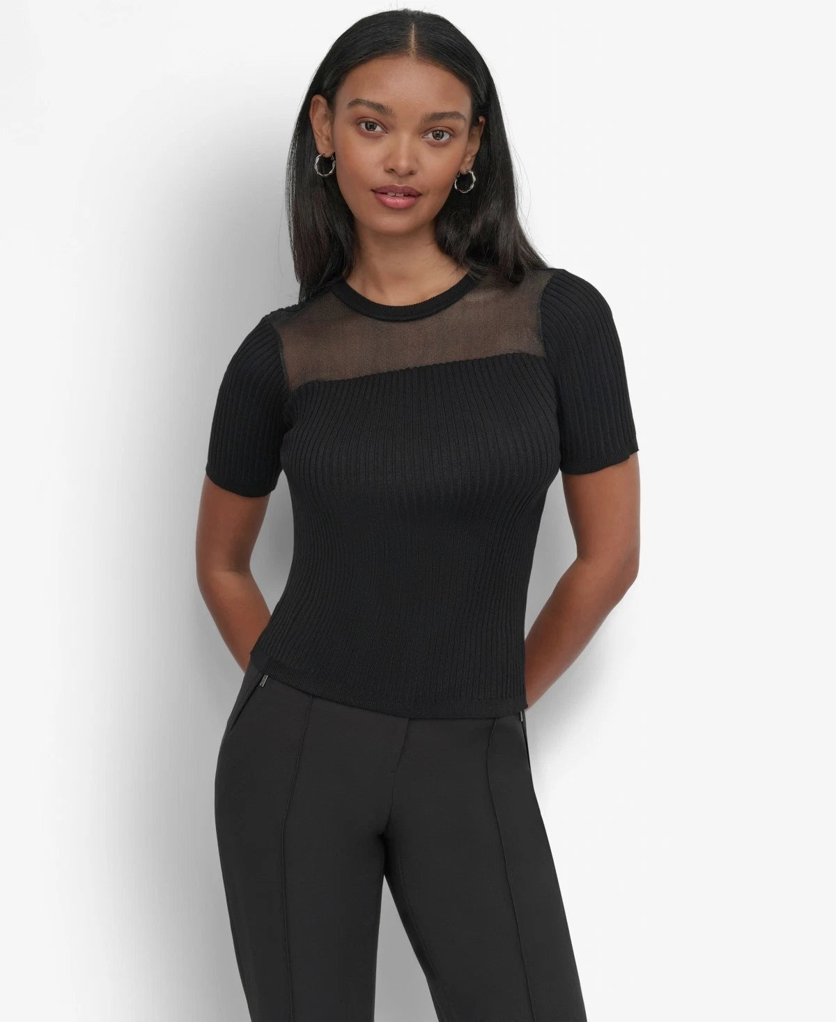 A sheer inset lends a modern feel to this short-sleeve sweater from DKNY.
