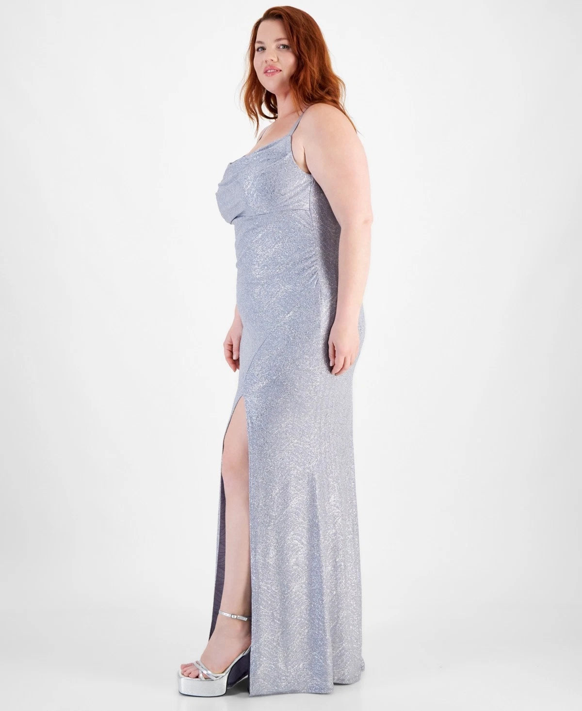 Steal the spotlight in this trendy plus size drape-sweetheart neck glitter gown with a high slit from Emerald Sundae, perfect for a glamorous and chic look that dazzles!