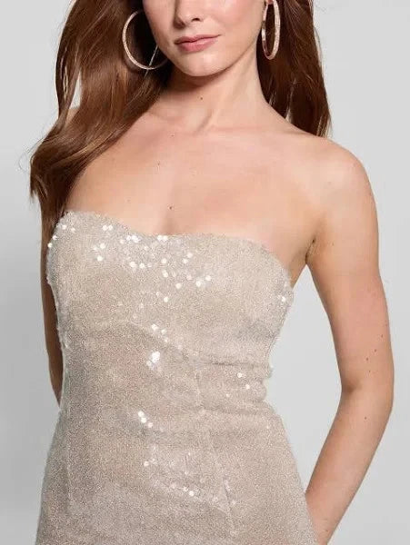 Shine with elegance in this women's fitted sequin strapless dress from GUESS, offering a glamorous, eye-catching look perfect for any unforgettable evening.