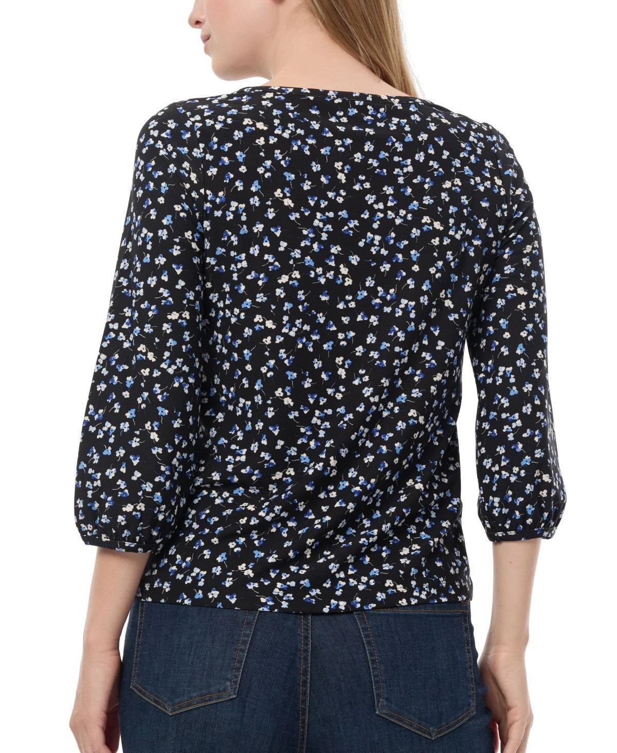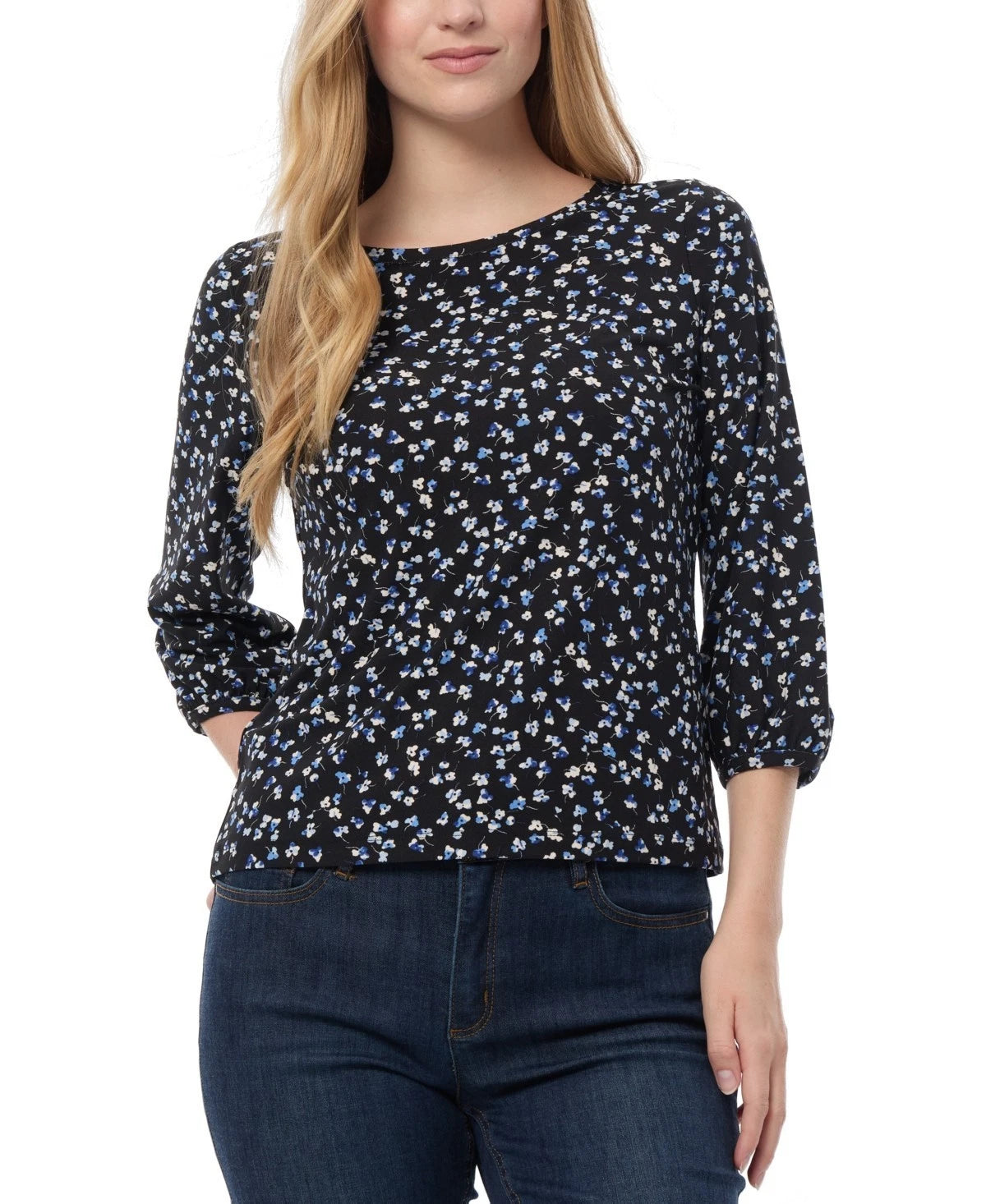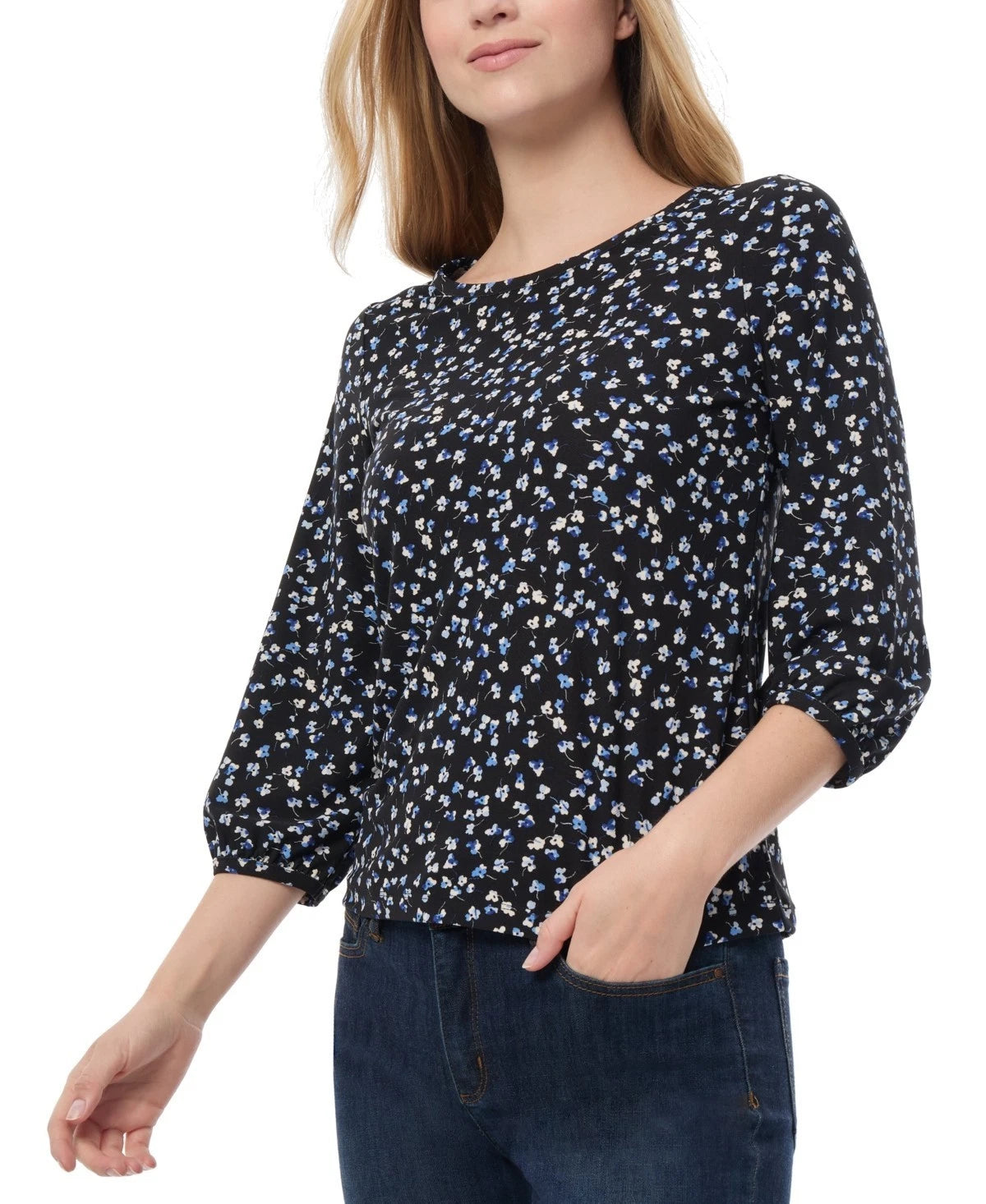 A dainty floral print cascades over this petite Jones New York top, bringing sweet hints of spring whenever you wear the 3/4-sleeve style.