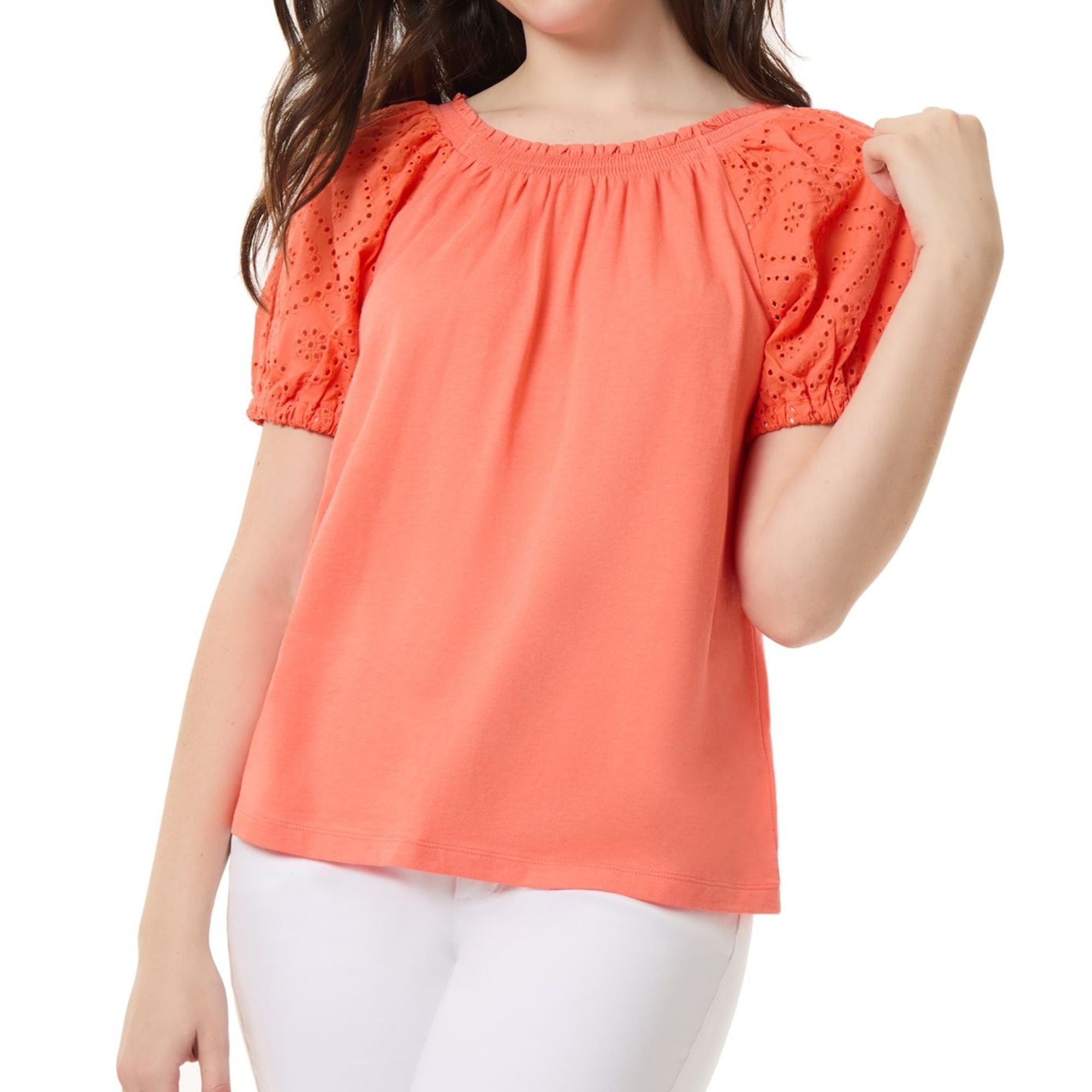 Jones New York Petite Embroidered-Sleeve Smoc Coral Sun PS