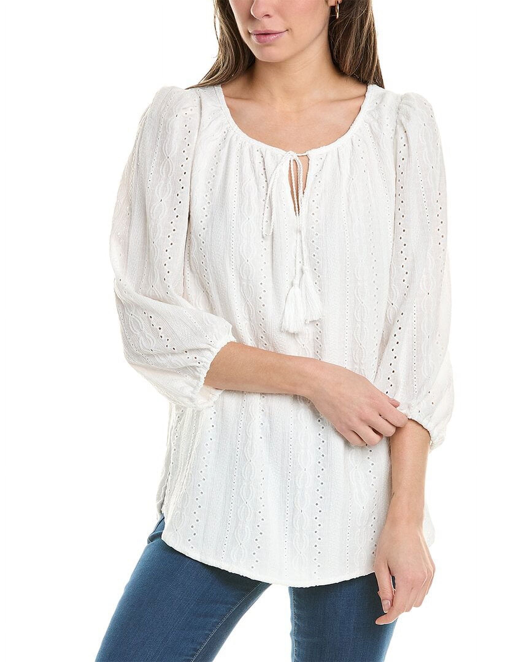 Design details: split neckline with self-tie closure, tassel accents, eyelet embroidery, elastic cuffs and curved hem 95% polyester, 5% elastane Lining: 100% polyester Machine wash Imported