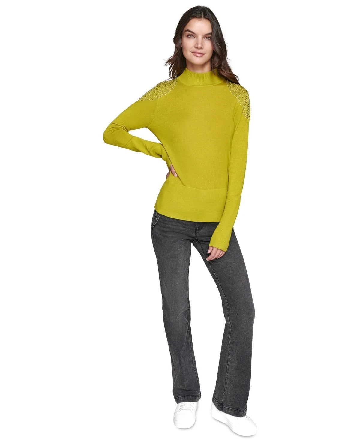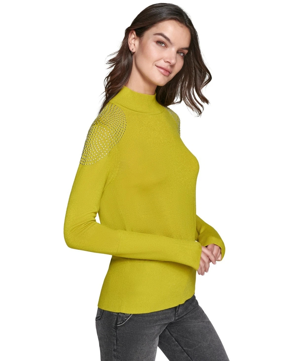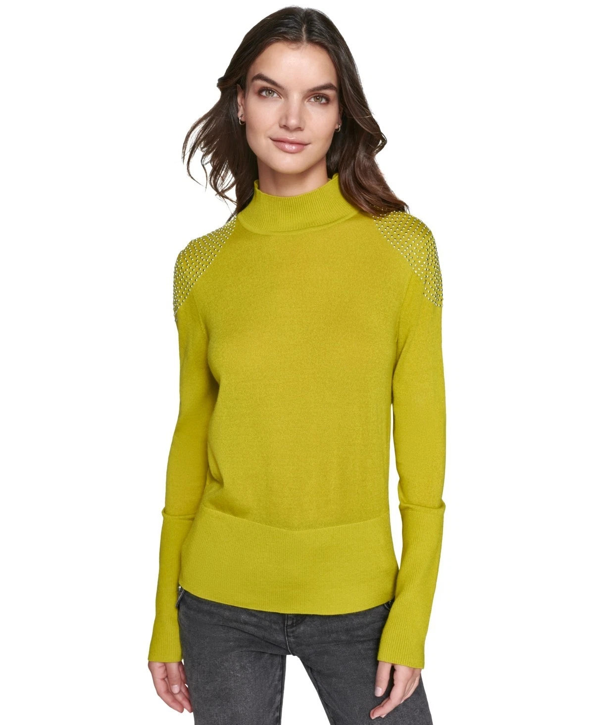 KARL LAGERFELD PARIS Studded-Shoulder Turtleneck Sweater Green Size XS MSRP $109