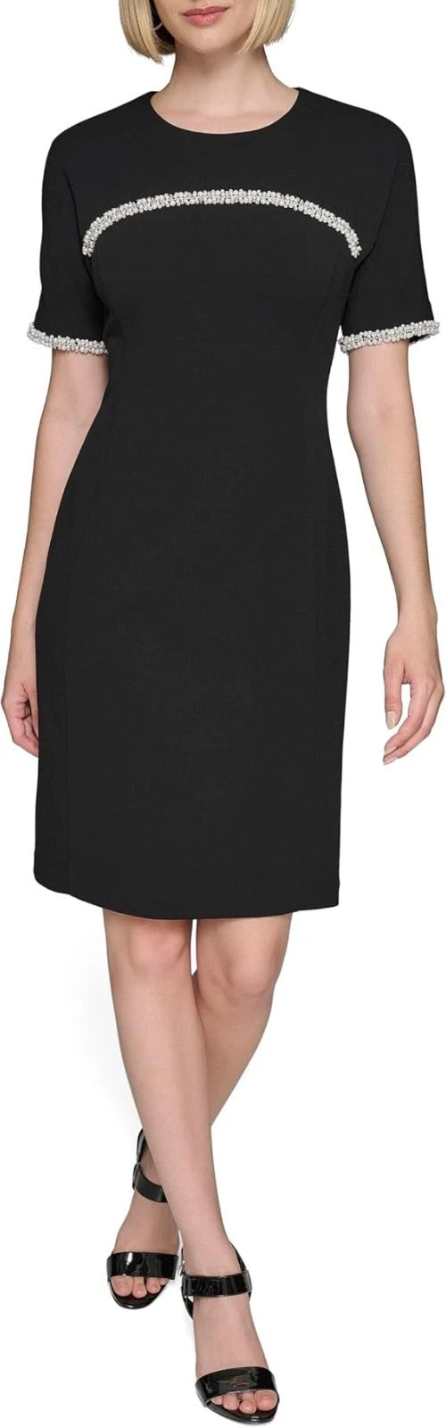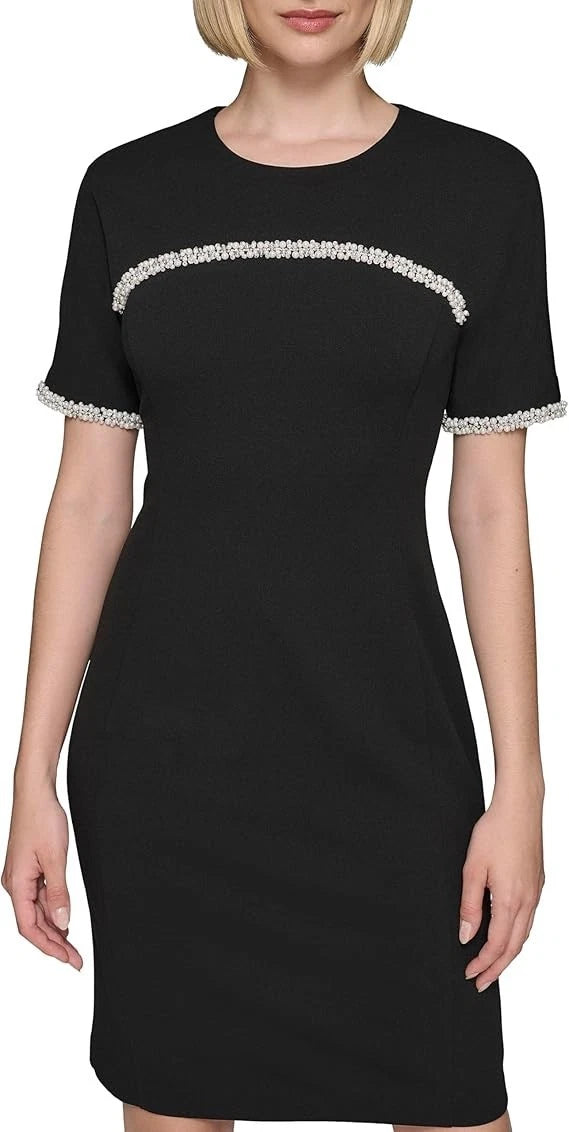 * Features: sheath dress, short sleeve, round neck, scuba crepe, pearl trim, short length