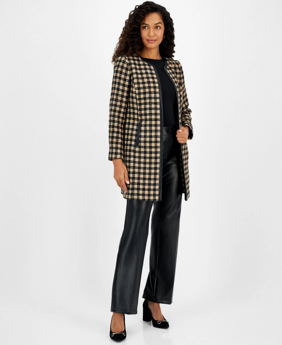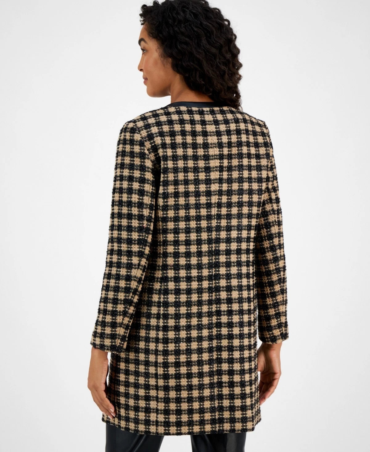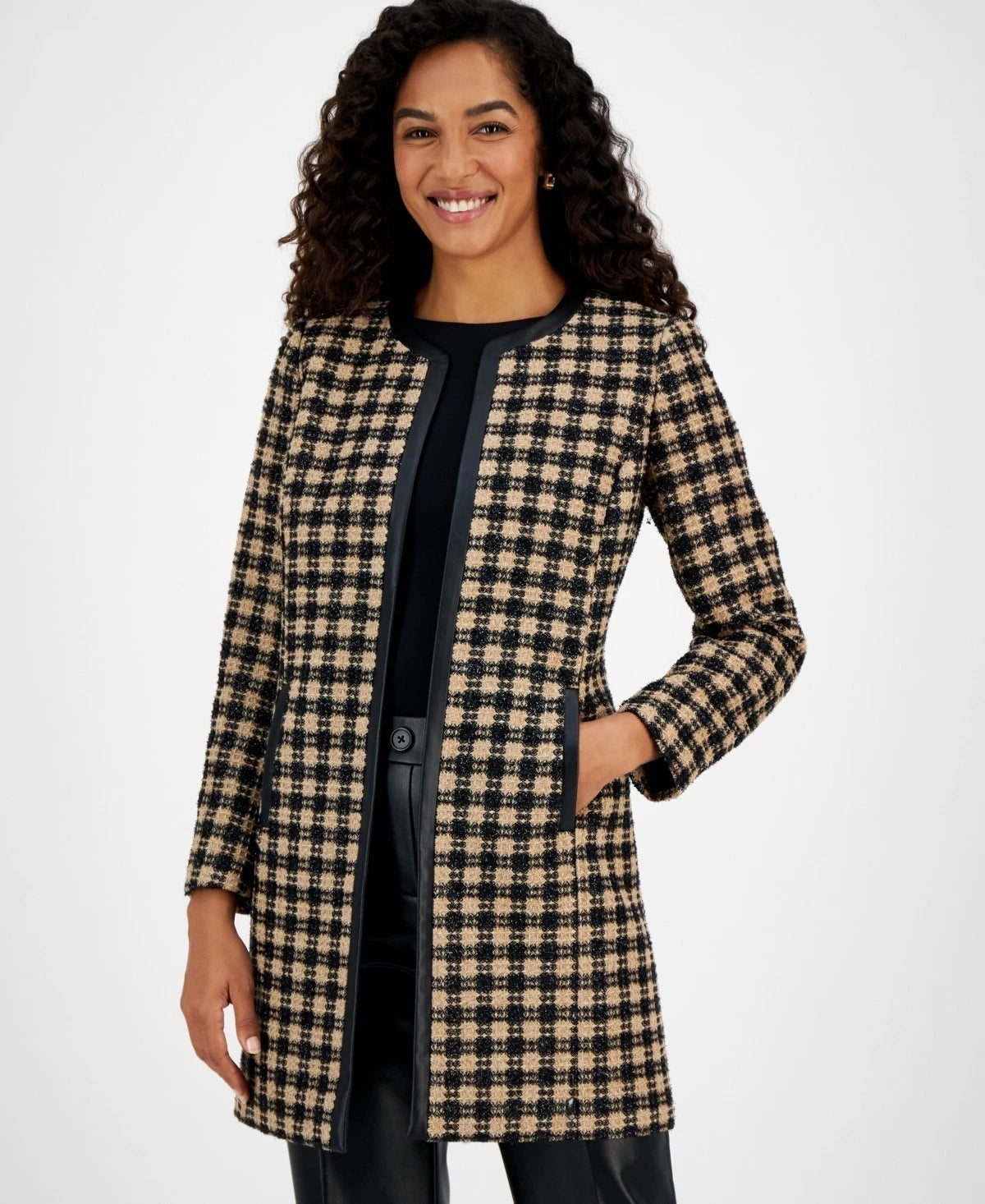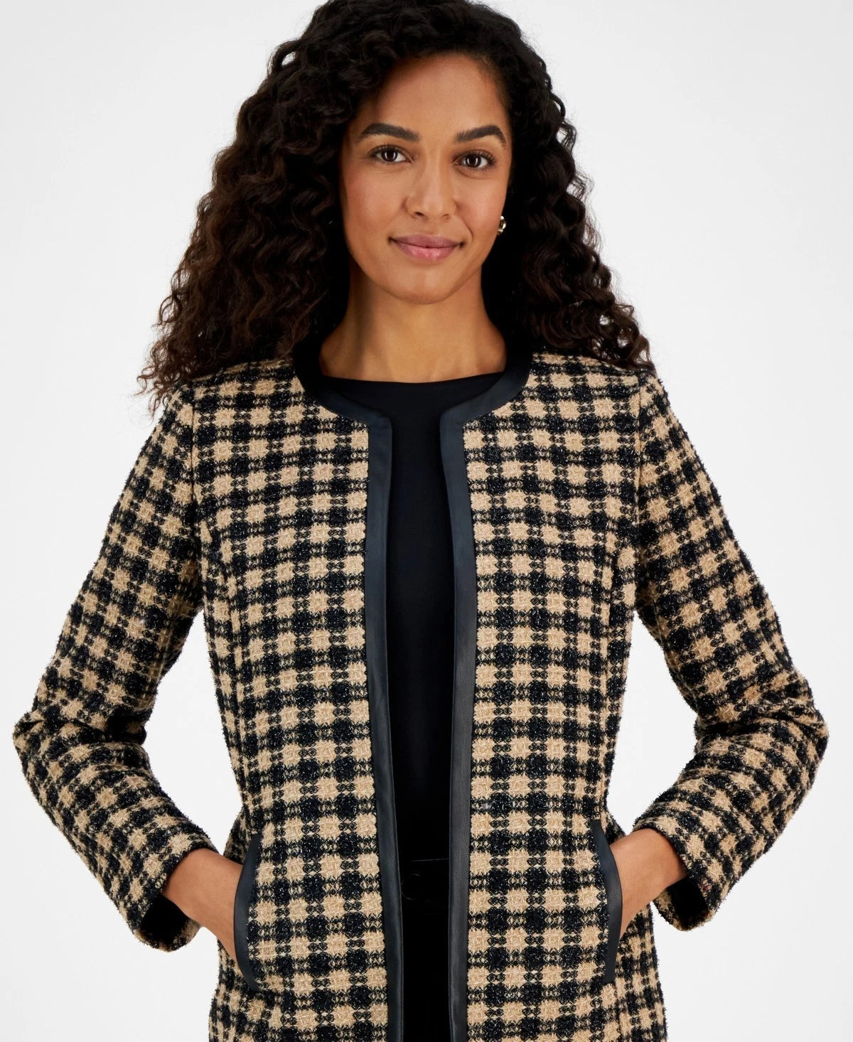 Top off your outfit with a sophisticated look with this petite jacket from Kasper, a versatile open front design detailed in a timeless plaid print and trimmed with modern faux leather.