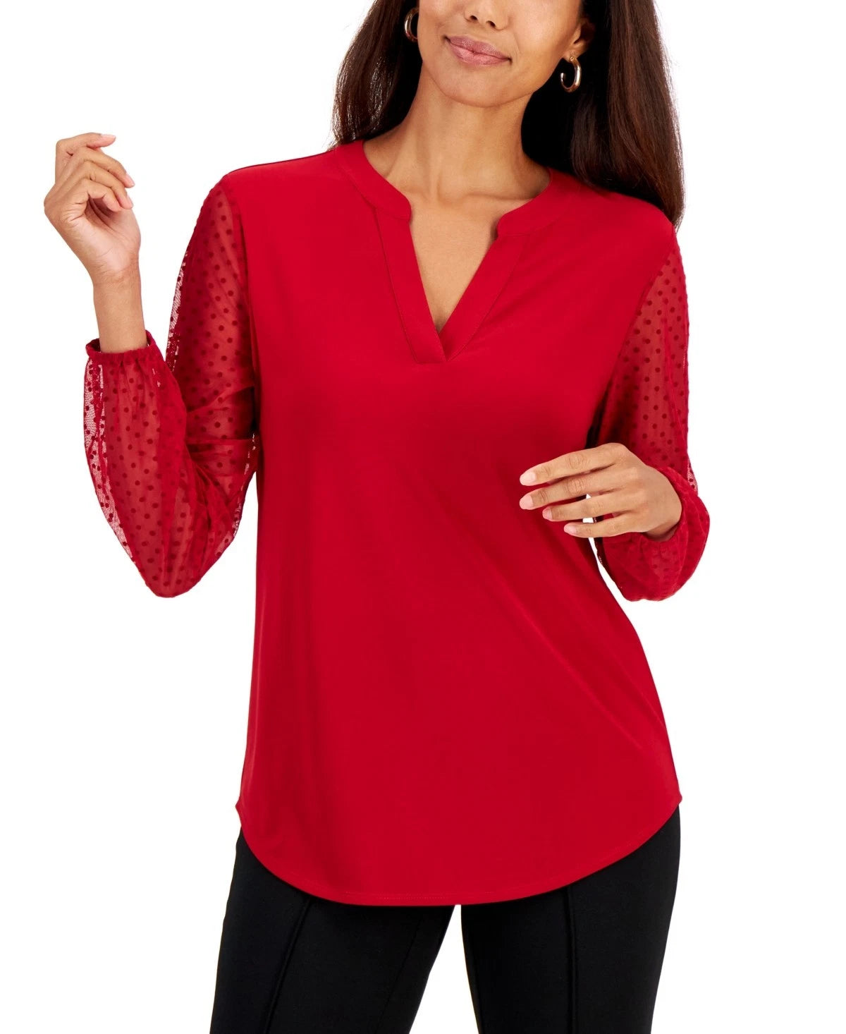 Kasper combines a classic and sophisticated split-neck top with sheer sleeves featuring a feminine clip-dot design.