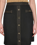 ** Sewn-in waistband; princess seams at skirt; slit at center back hem