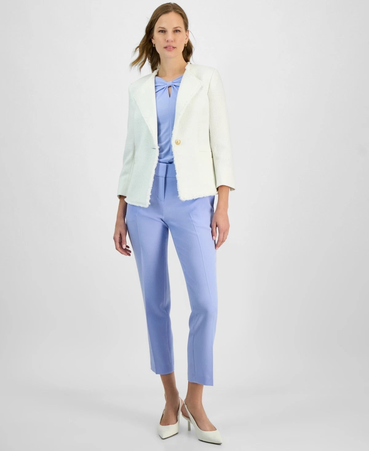 A perfect addition to your weekday collection, this modern tweed blazer from Kasper features a bold wing lapel and fringe trim at the edges.