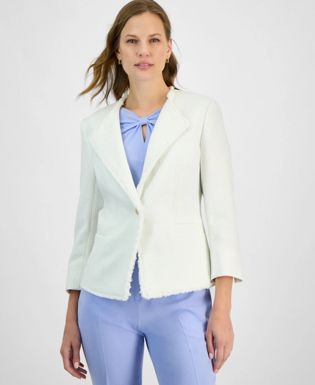 Kasper Women's Tweed One-Button Fringe Blazer Vanilla White Size P MSRP $139