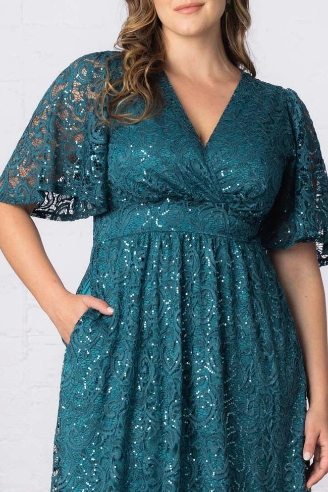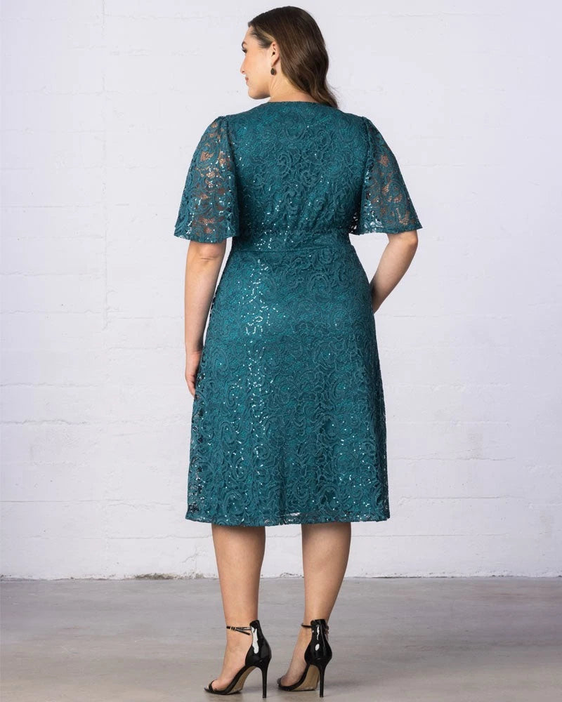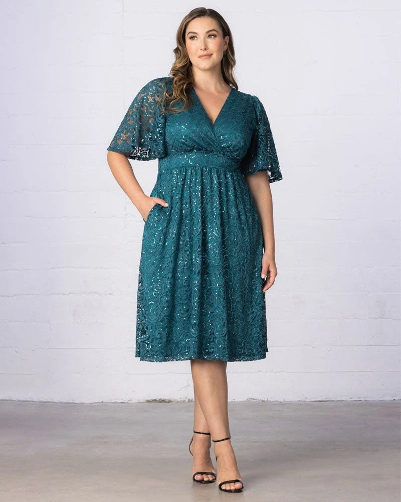 Sparkle at your next soiree in our Starry Sequined Lace Cocktail Dress. This party dress features a flattering surplice neckline, flirty flutter sleeves and a graceful A-line silhouette. This sparkly little outfit even has a surprise element - pockets! Perfect for that best dressed curvy wedding guest or any special occasion from holiday party to formal gala. This elegant plus-size sequin dress is offered in classic black, navy blue, gold champagne as well as a seasonal blue-green teal color.
