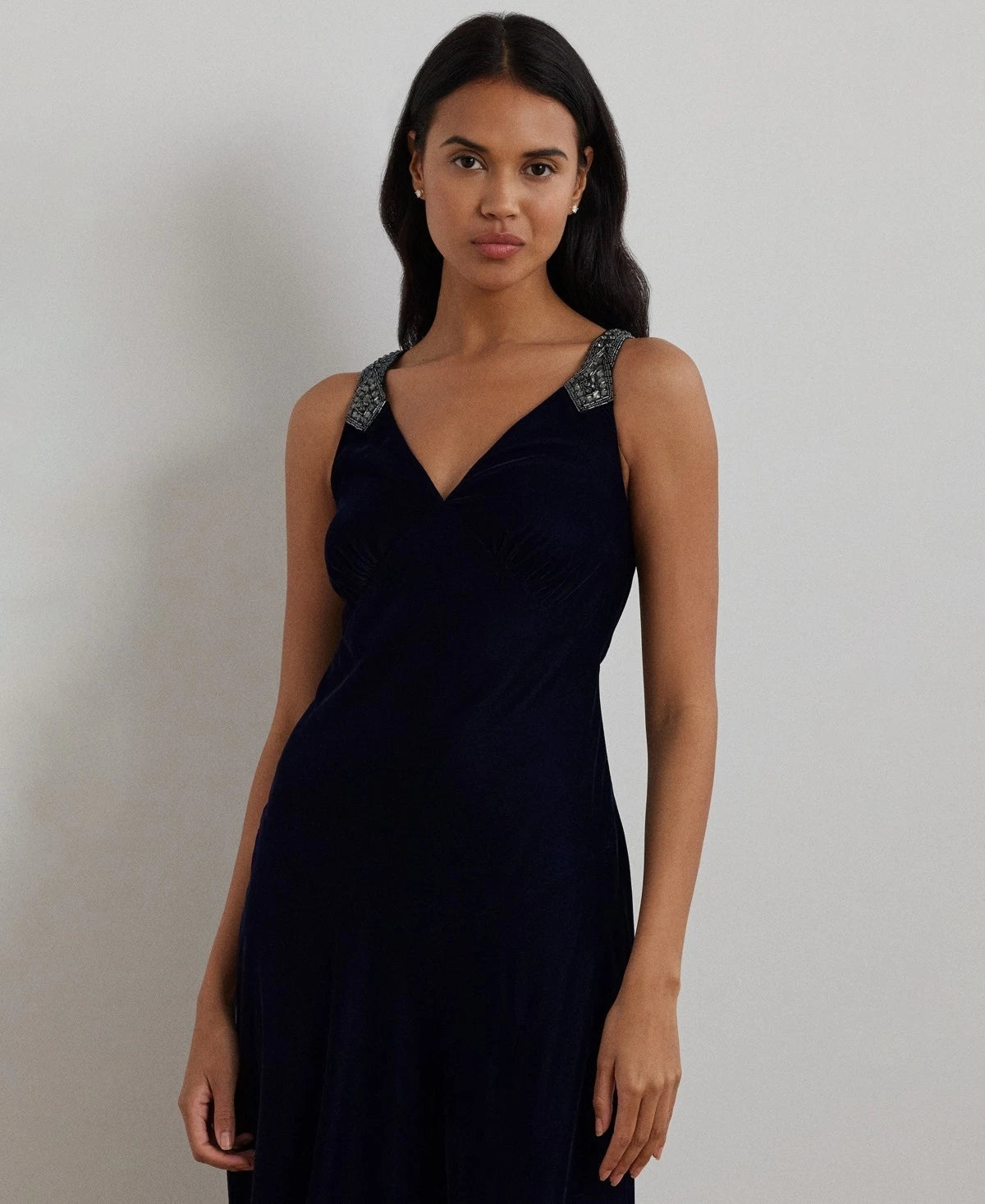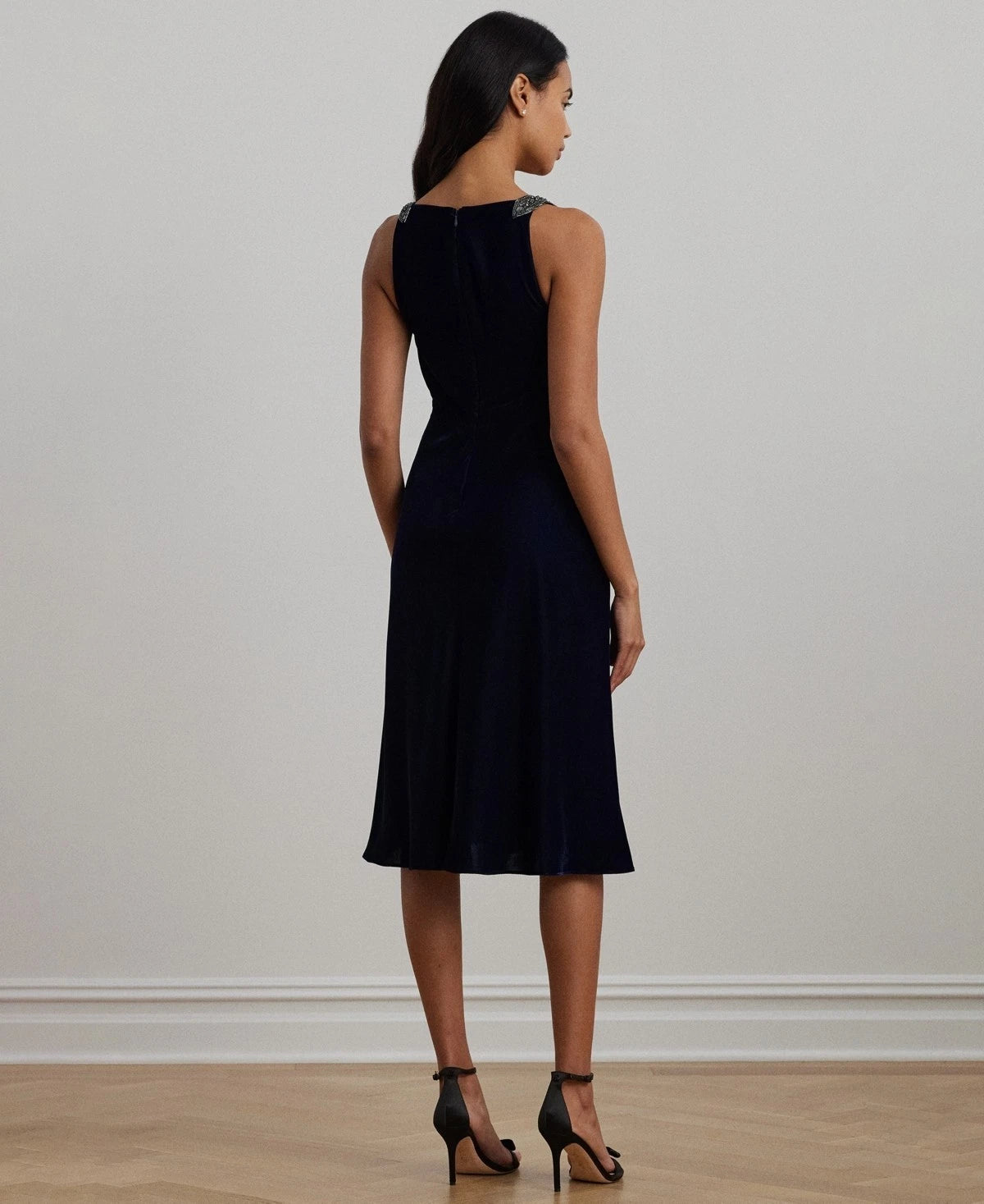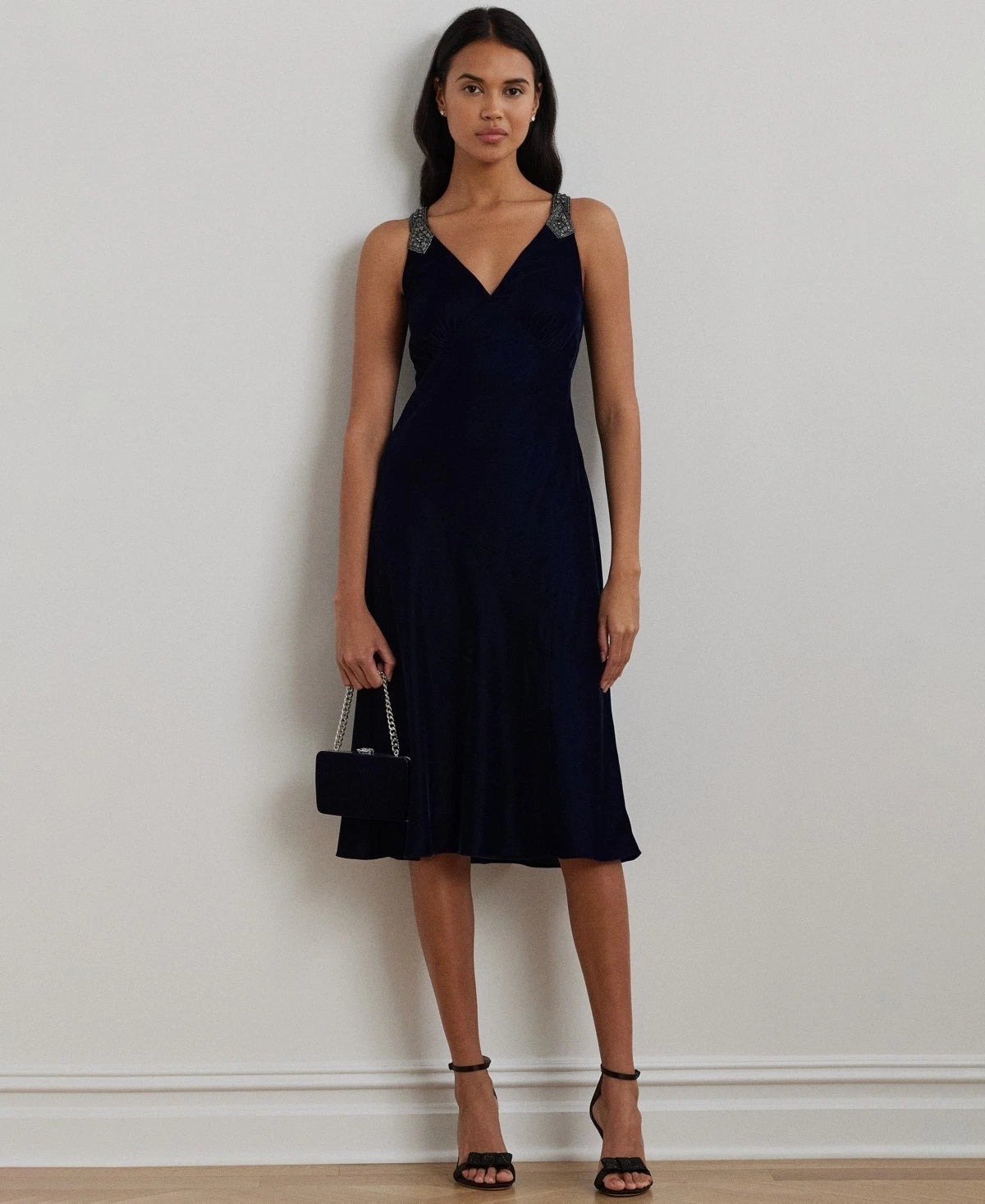 An empire waist enhances the A-line silhouette of this sleeveless cocktail dress from Lauren Ralph Lauren, which is cut for a calf-grazing midi length. With a plush velvet construction and glistening beaded straps, this glamorous style is a must-have for the holiday season.