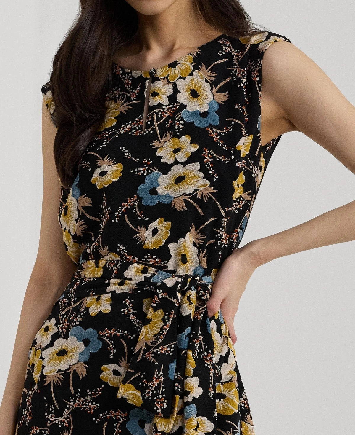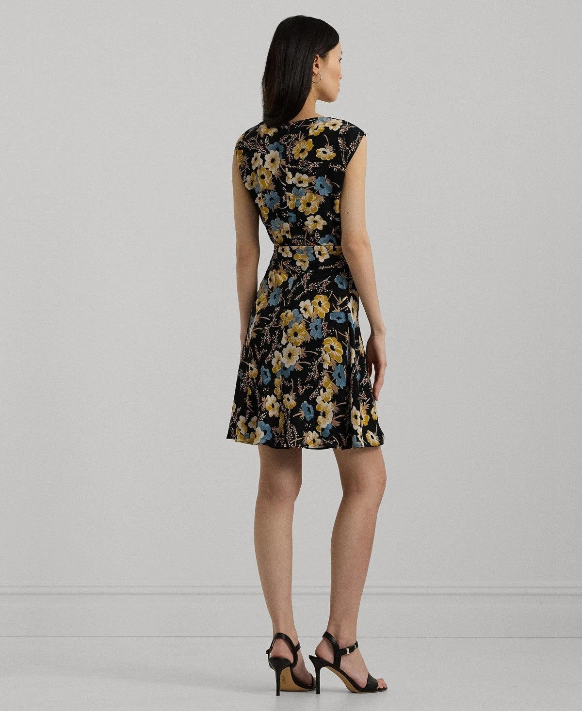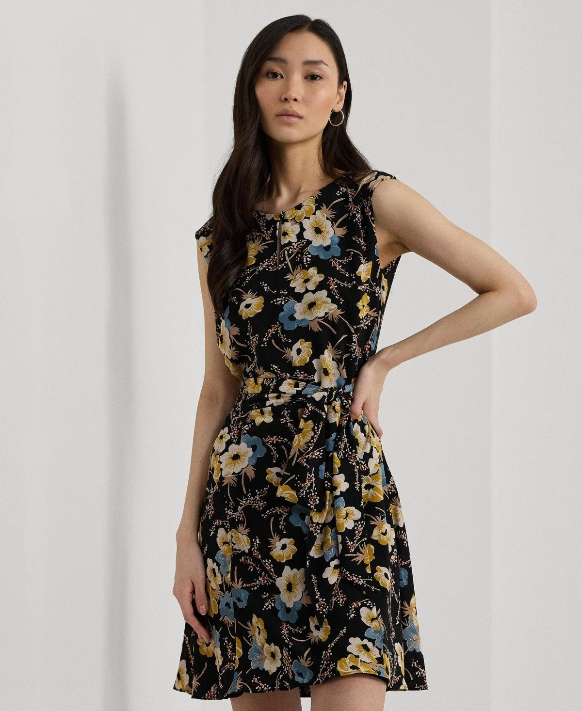 Enlivened by the season's enchanting floral motif, this cap-sleeve dress from Lauren Ralph Lauren features a flattering boatneck and a belted waist for a defined silhouette. This style is crafted with bubble crepe for an airy look and feel.