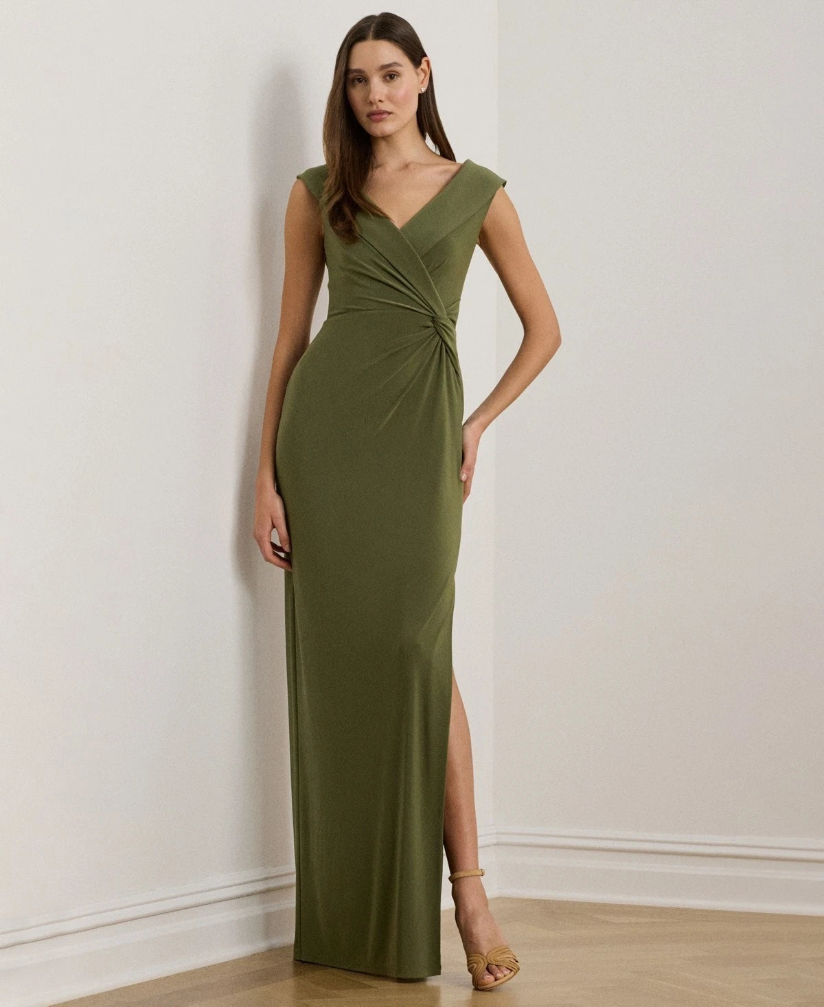 Crafted with smooth, body-hugging jersey, this column gown from Lauren Ralph Lauren is designed with an elegant off-the-shoulder silhouette and a chic twist detail at the waist. A slit at the skirt creates ease of movement.