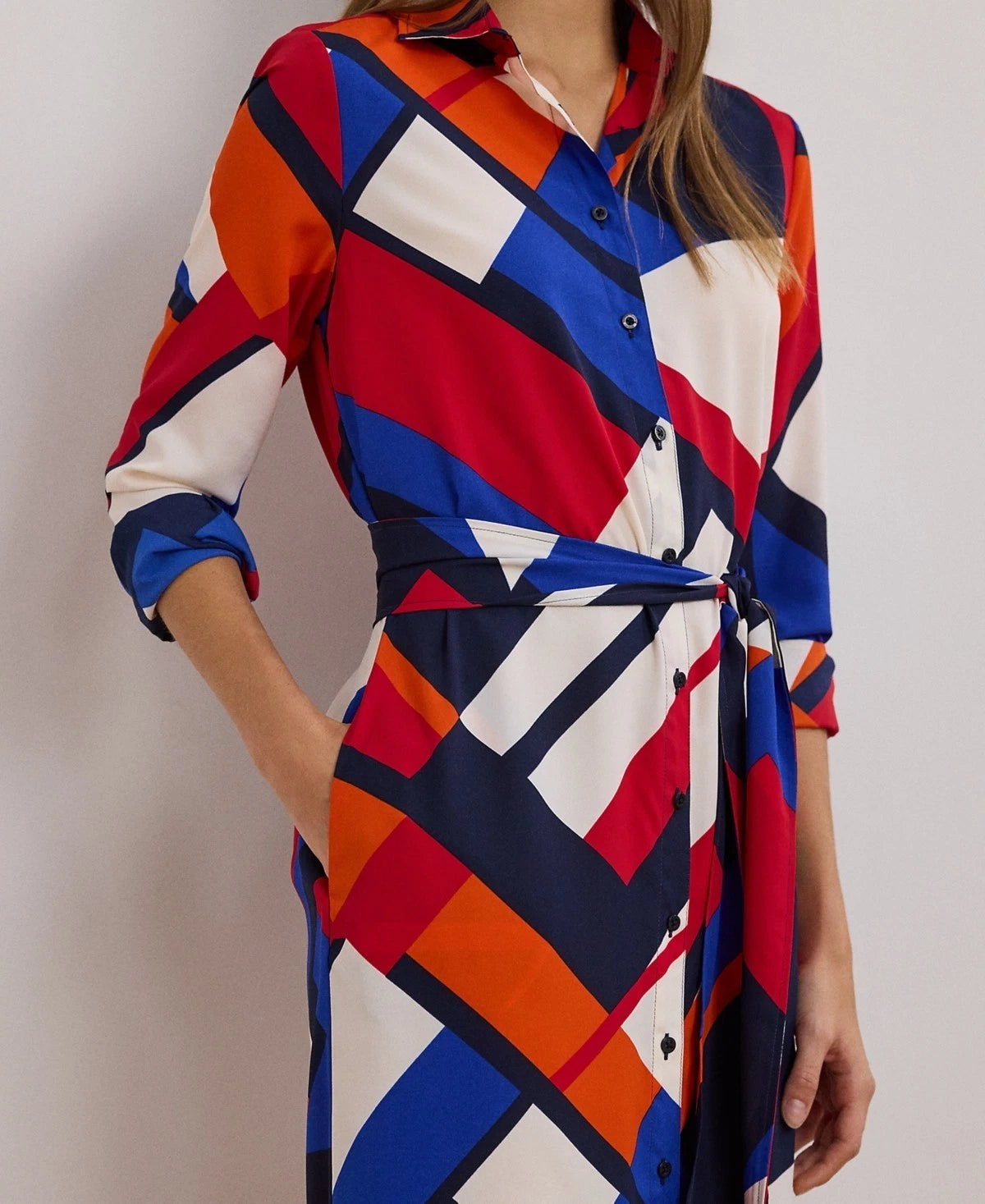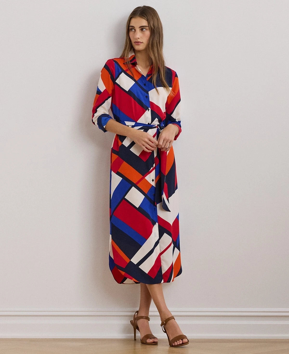 Crafted with crepe de chine for an airy look and feel, this shirtdress showcases a sailboat-inspired abstract motif. A self-belt at the waist creates a defined silhouette, while "Lauren Ralph Lauren"-engraved buttons provide signature style.