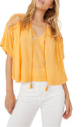 * Three-quarter-length bell sleeves with cascading ruffle trim