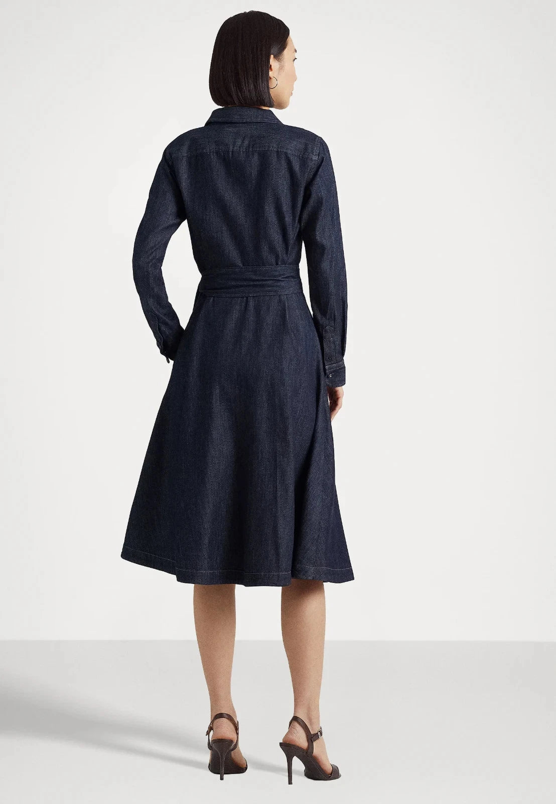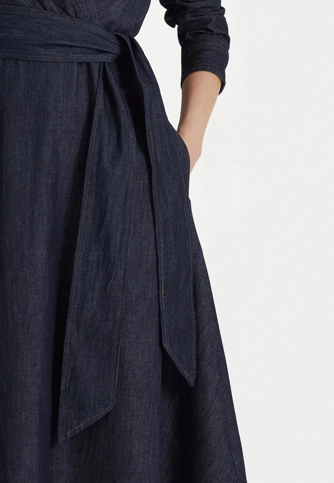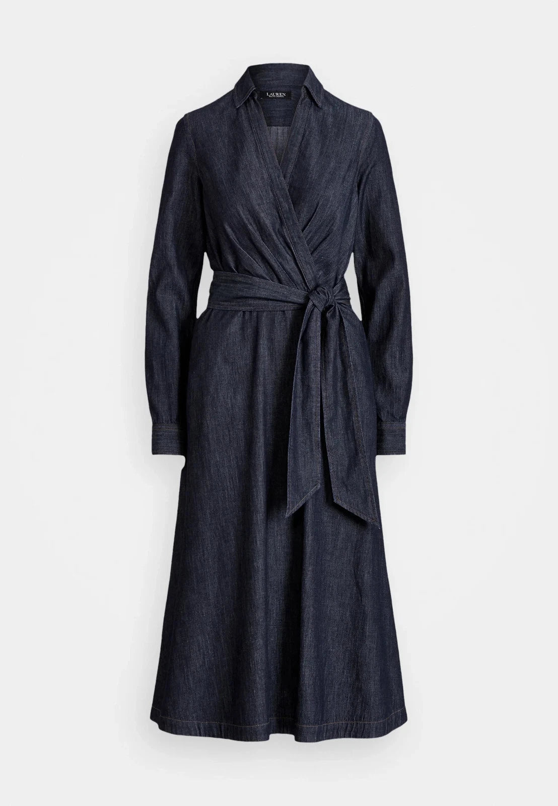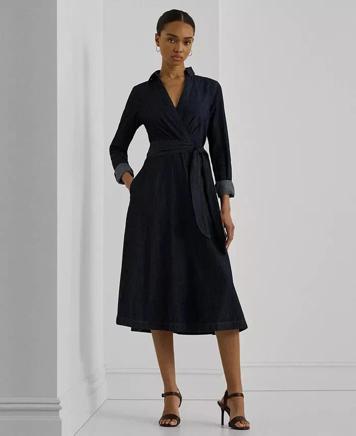 A faux-wrap bodice, a belted waist, and side on-seam pockets add to the casual allure of Lauren Ralph Lauren's midi dress, while a point collar and buttoned barrel cuffs afford sophistication. An airy georgette fabrication creates ease of movement.
