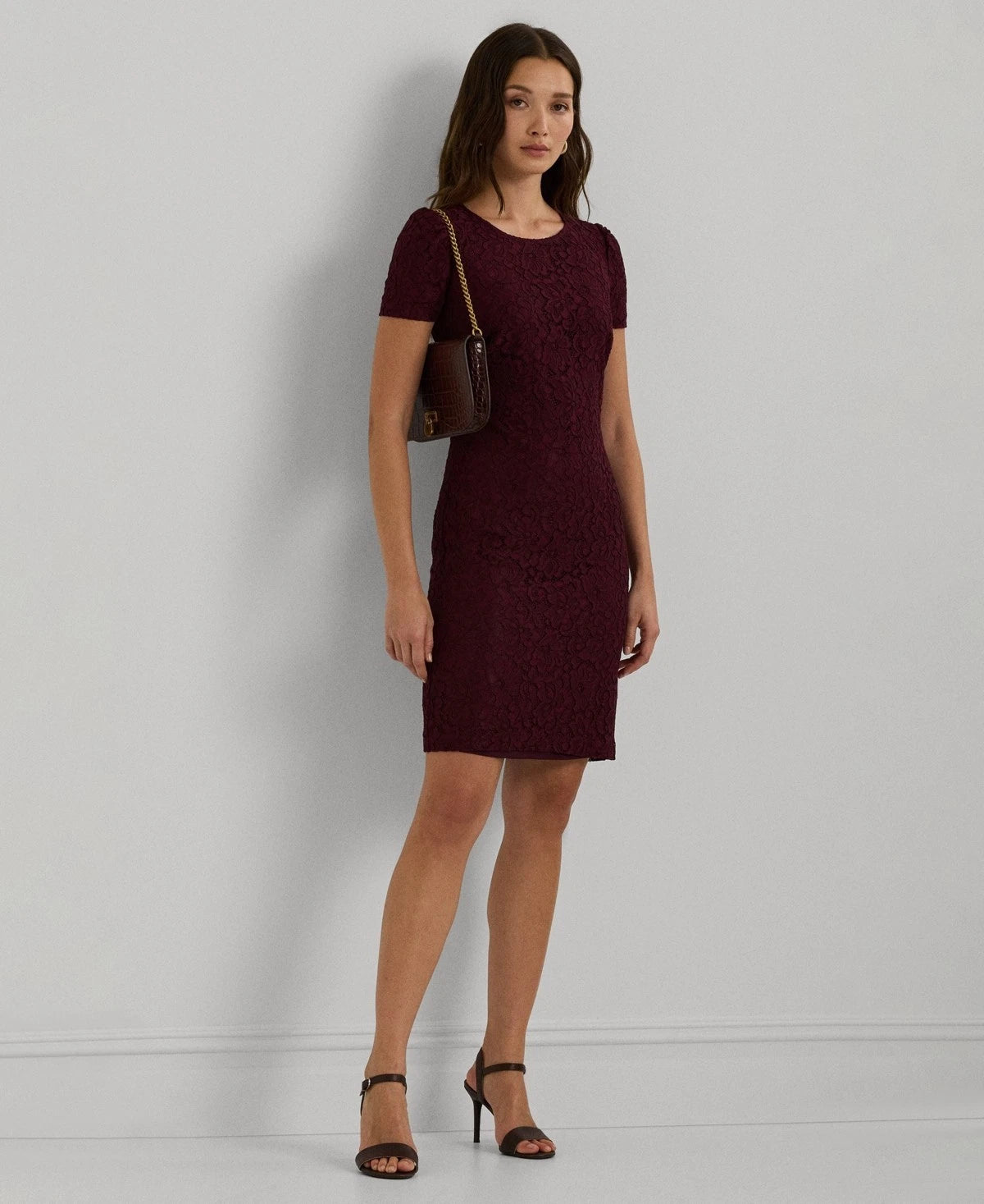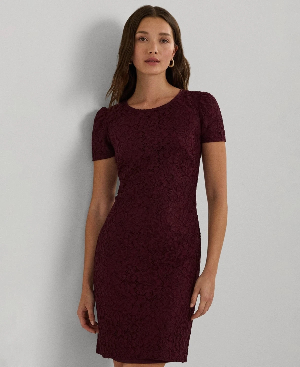 Capturing the spirit of romance, Lauren Ralph Lauren's slim-fitting cocktail dress is characterized by a floral corded lace construction and puffed sleeves.