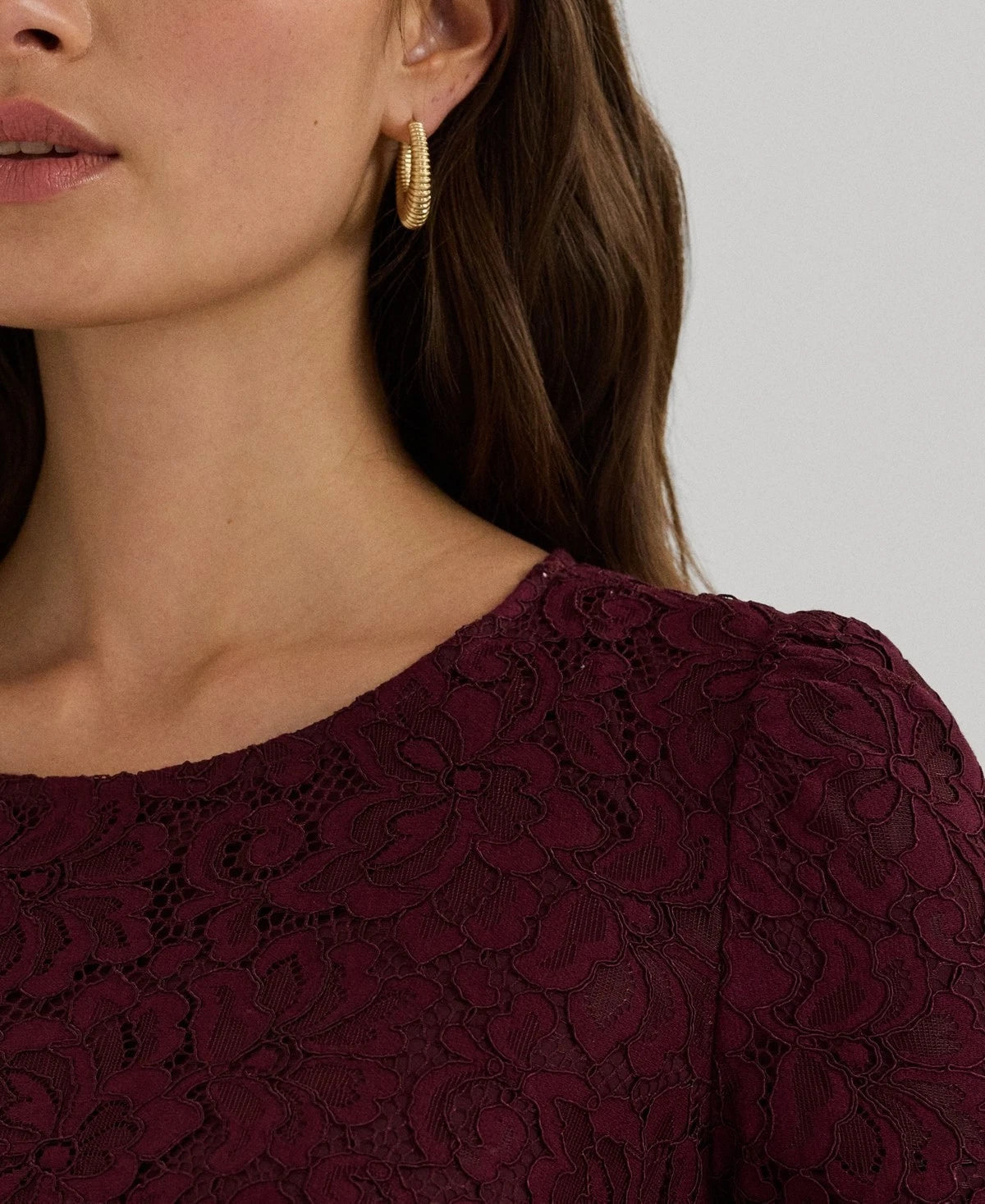 Capturing the spirit of romance, Lauren Ralph Lauren's slim-fitting cocktail dress is characterized by a floral corded lace construction and puffed sleeves.