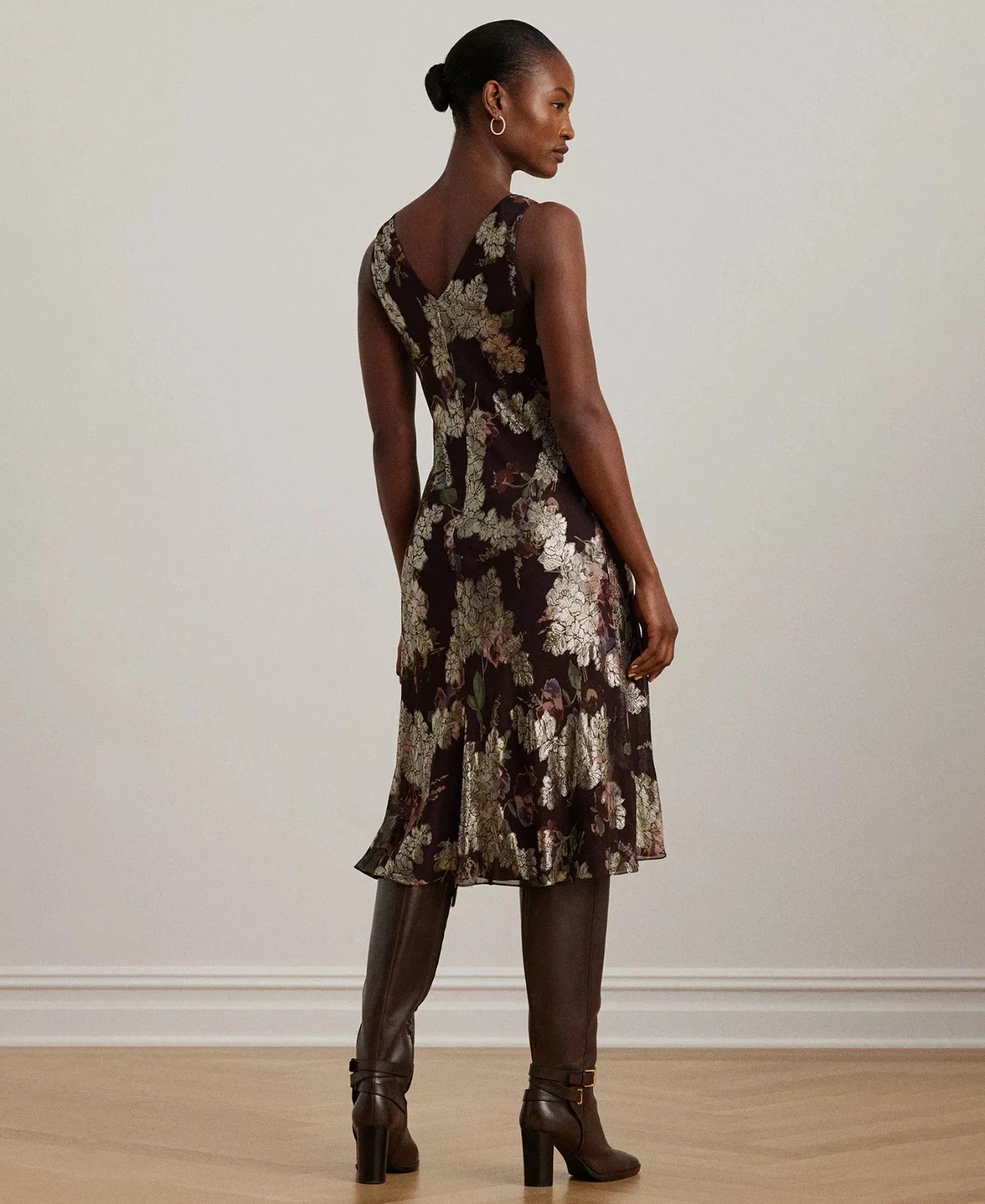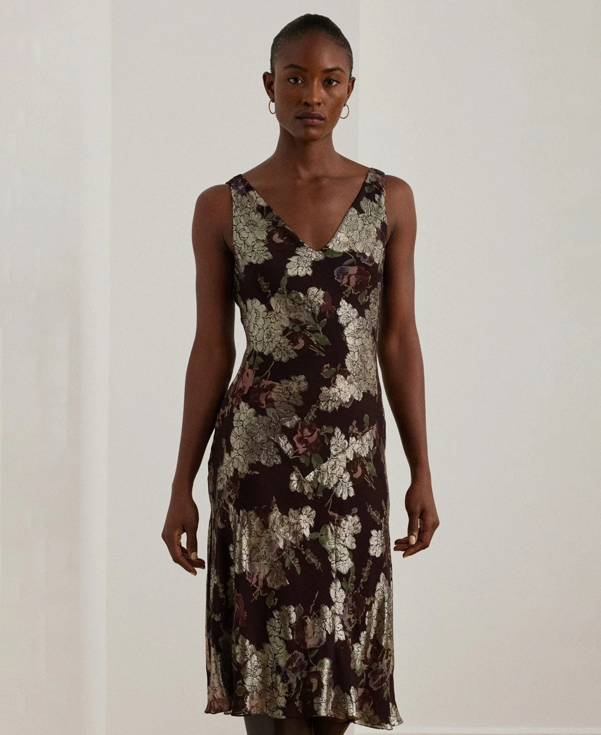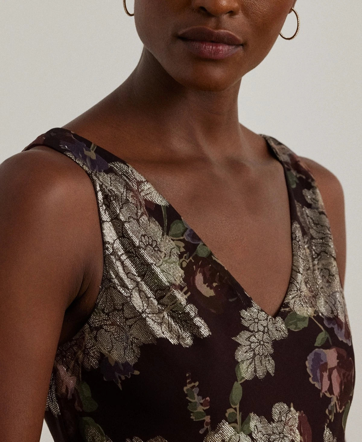 Showcasing the season's romantic floral motif, Lauren Ralph Lauren's sleeveless cocktail dress is realized in lightweight metallic jacquard for an effortless drape and a touch of shimmer.