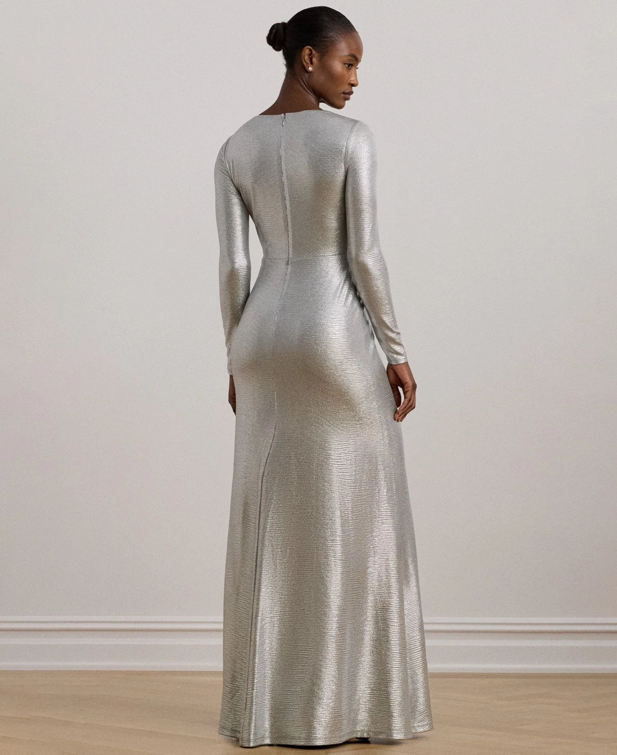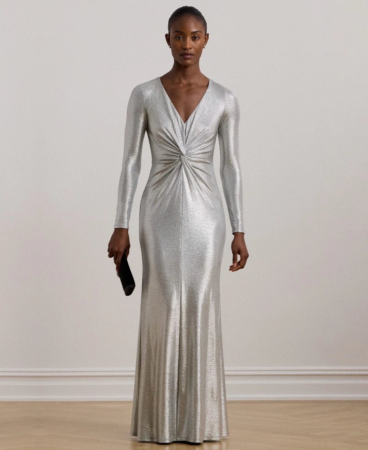 Rendered in a stretch-infused knit fabric with a radiant metallic finish, this evening gown from Lauren Ralph Lauren is characterized by a chic twisted detail and a statuesque column silhouette, making it an elegant choice for your next occasion.