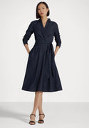 A belted waist enhances the fit-and-flare silhouette of this surplice midi dress, which is designed with a tiered skirt for graceful movement. Rolled sleeves and dropped shoulders lend to its effortless appeal, while a lightweight stretch-cotton-blend fabrication affords a silky hand.
