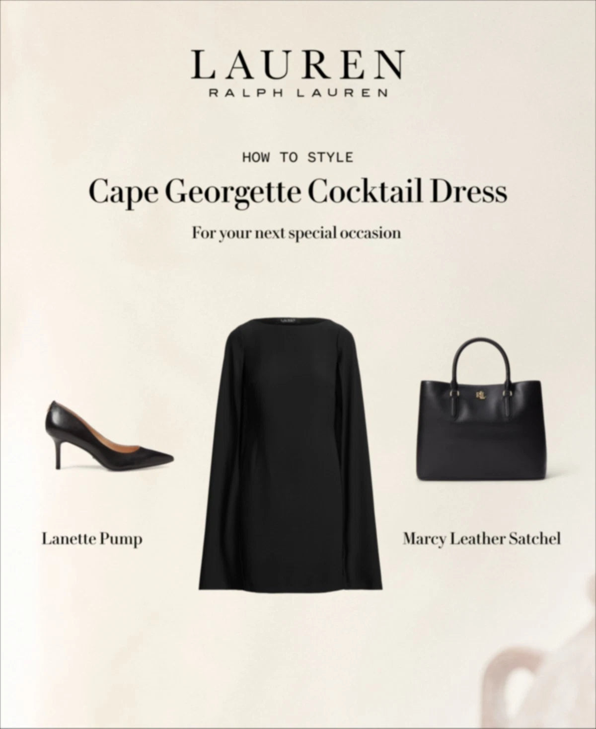 A stylish choice for special occasions, this modern georgette cocktail dress from Lauren Ralph Lauren is elevated by a cascading cape, which adds fluid movement to its body-hugging silhouette.